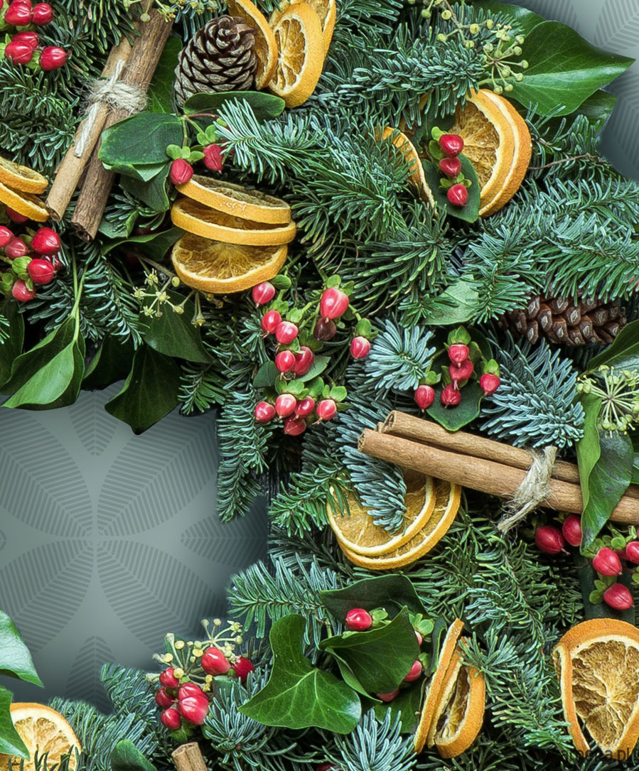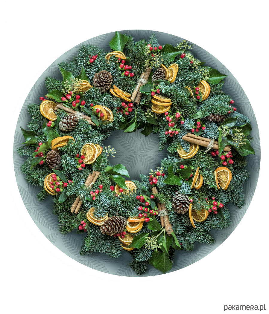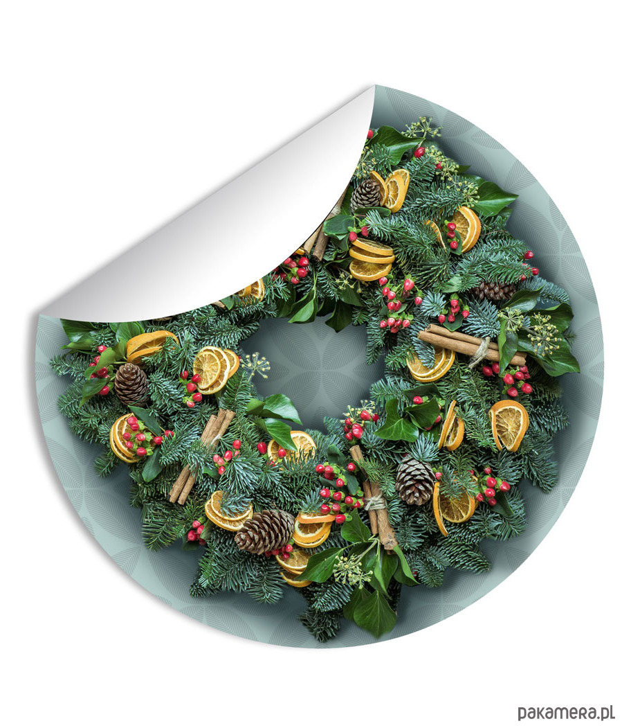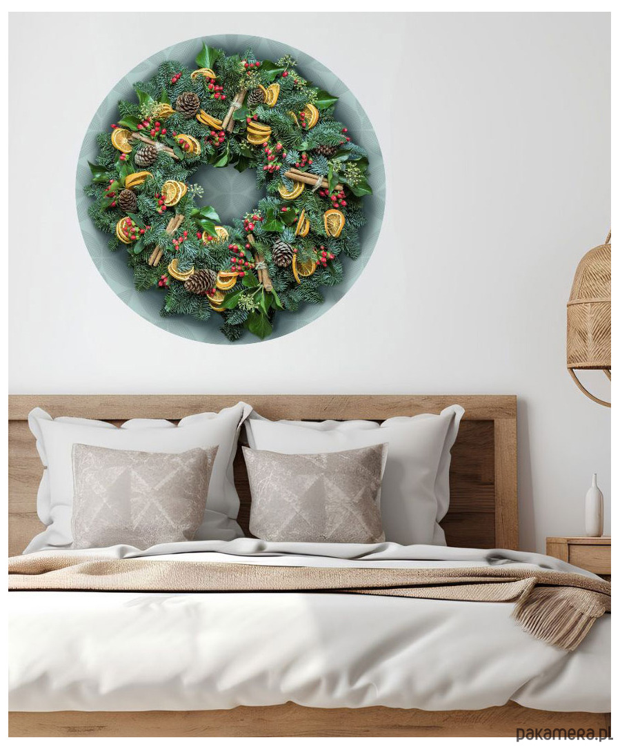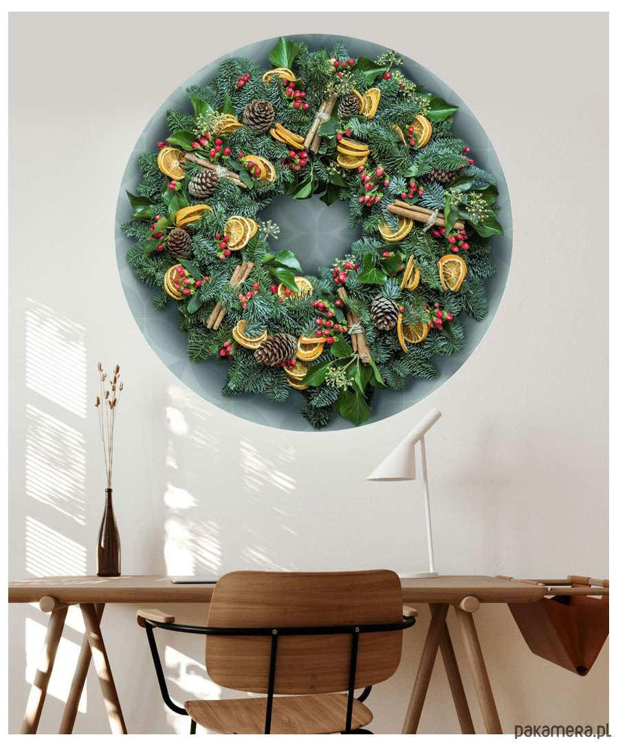 Nowa wyjątkowa, limitowana kolekcja świątecznych naklejek samoprzylepnych na ścianę, w kształcie koła o średnicy 100 cm. Wianek z Pomarańczami i Cynamonem - gęsty, tradycyjny wieniec bogato udekorowany suszonymi plastrami pomarańczy, laskami cynamonu i drobnymi czerwonymi jagodami. Klimat Świąt w wizualnej formie.
