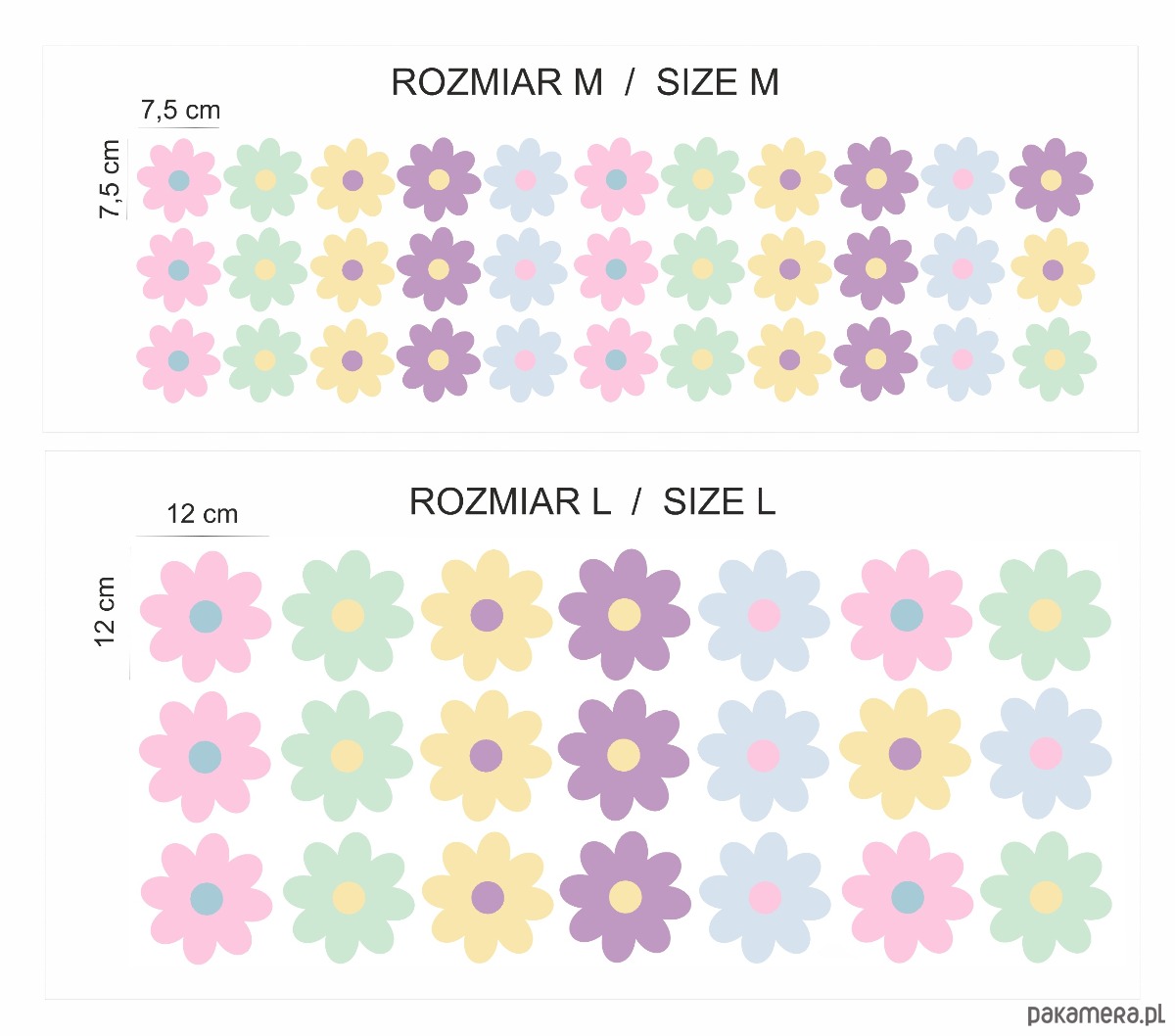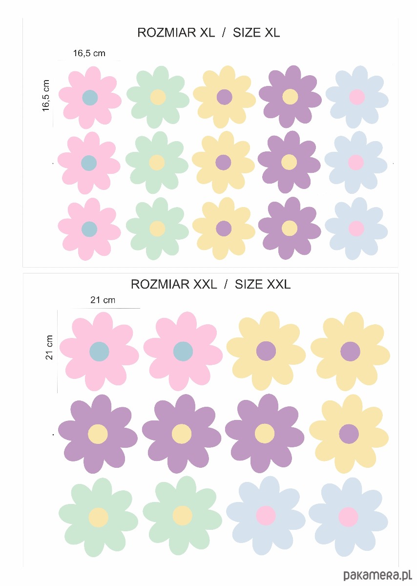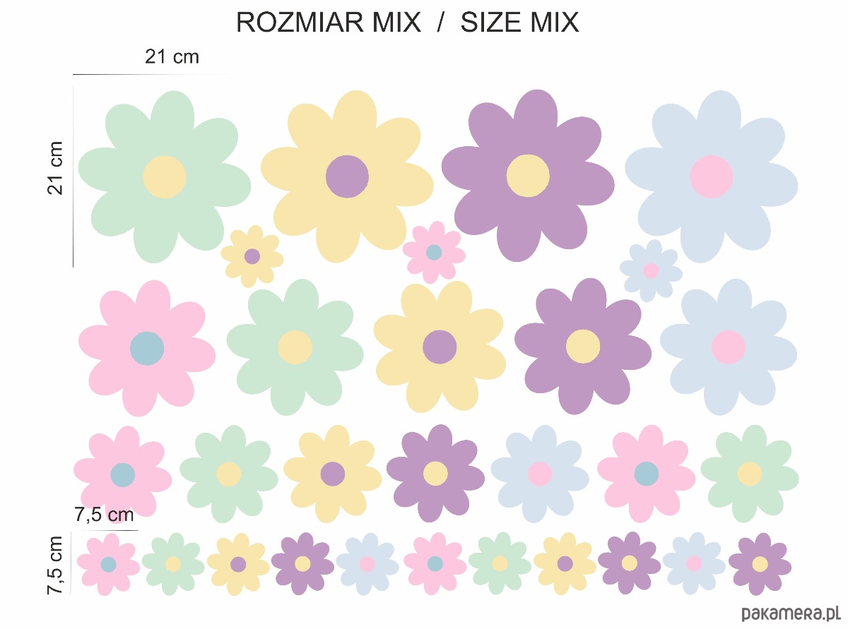 MIX - różne rozmiary stokrotek - rozmiar około 7,5 cm (14 naklejek), 12 cm (7 naklejek), 16,5 cm (5 naklejek), 21 cm (4 naklejki) łącznie 30 naklejek