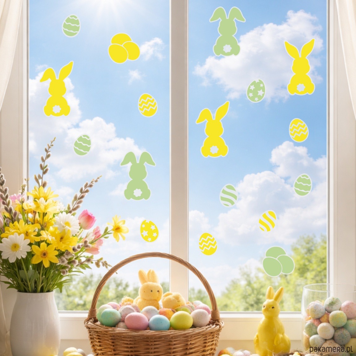 Stwórz w swoim domu radosną, wiosenną atmosferę dzięki uroczym naklejkom wielkanocnym na okno. Zestaw zawiera kolorowe zajączki i pisanki, które pięknie prezentują się na szybie, wpuszczając do wnętrza światło i dodając świątecznego klimatu.