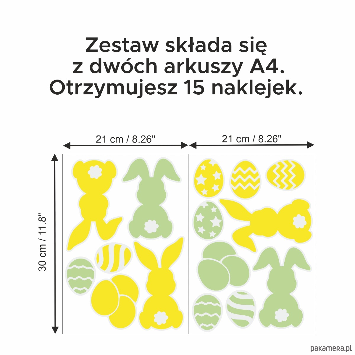 Naklejki wykonane są z lekkiego, półprzezroczystego materiału, dzięki czemu świetnie wyglądają zarówno od środka, jak i z zewnątrz okna. Delikatne pastelowe kolory – żółty i zielony – idealnie pasują do wiosennych dekoracji oraz wielkanocnych aranżacji.