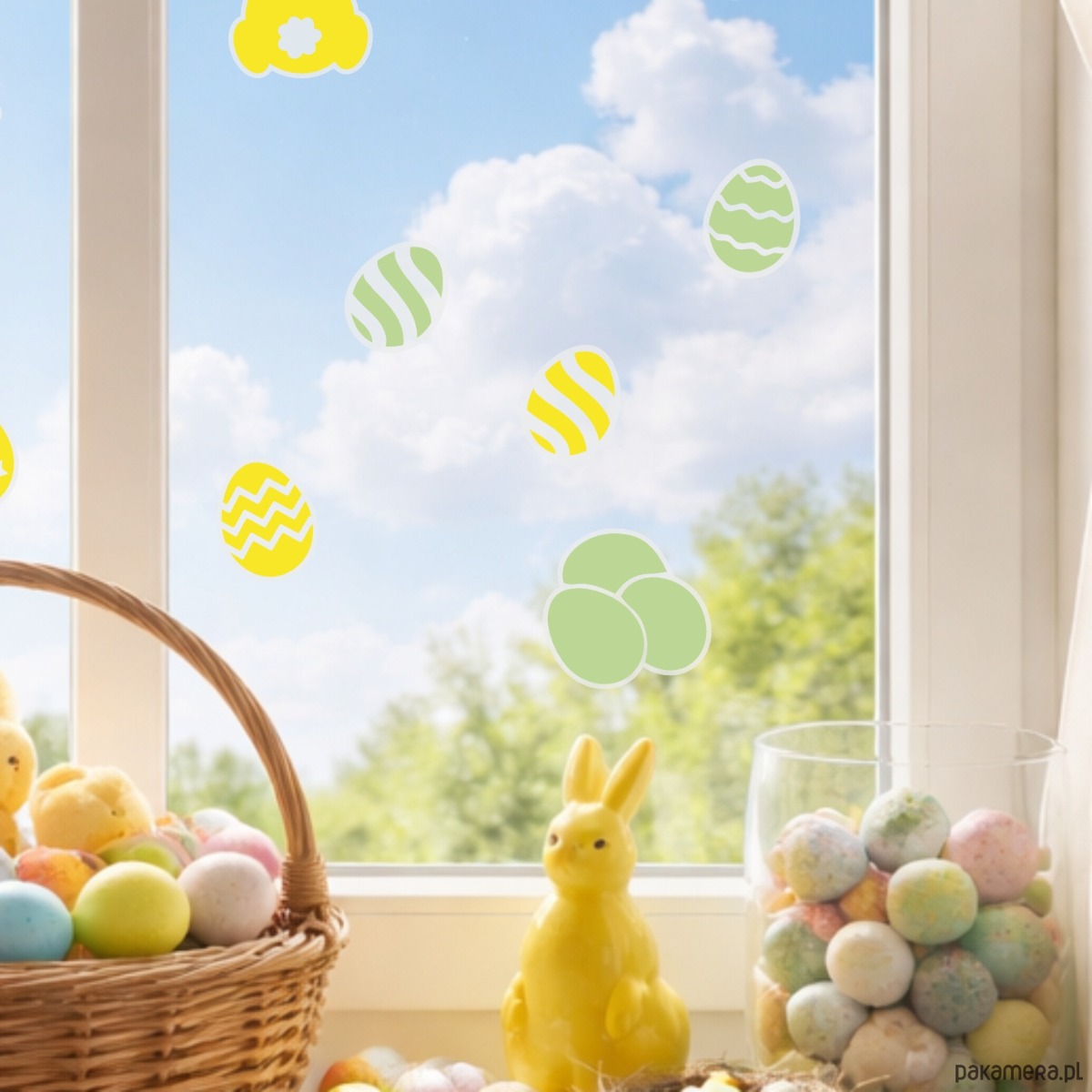 Naklejki można dowolnie rozmieszczać na szybie, tworząc własną, świąteczną kompozycję. Doskonale sprawdzą się jako dekoracja domu, pokoju dziecięcego lub witryny sklepowej w okresie Wielkanocy. Wprowadź do swojego wnętrza wiosnę, kolor i wielkanocną radość!