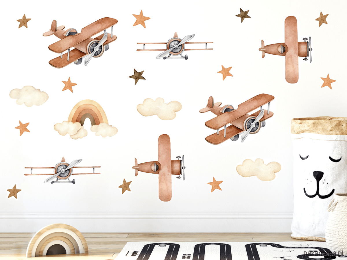 Naklejki ścienne Samoloty w rozmiarze 50×100 cm to wyjątkowa dekoracja, która zamieni pokój dziecka w przestrzeń pełną wyobraźni. Delikatna akwarelowa stylistyka i stonowane barwy w odcieniach brązu i beżu tworzą przytulny klimat i idealnie wpisują się w aranżacje w stylu boho, vintage i skandynawskim.