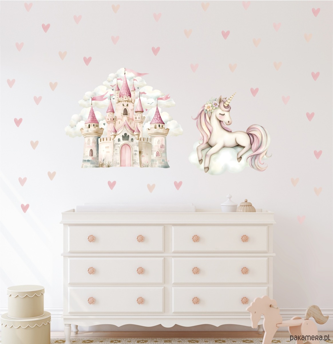 Naklejki ścienne dla dzieci Zamek, Jednorożec i serduszka A252