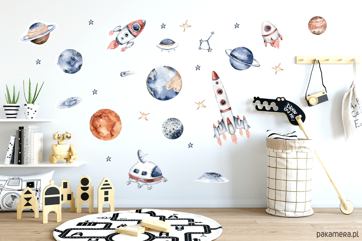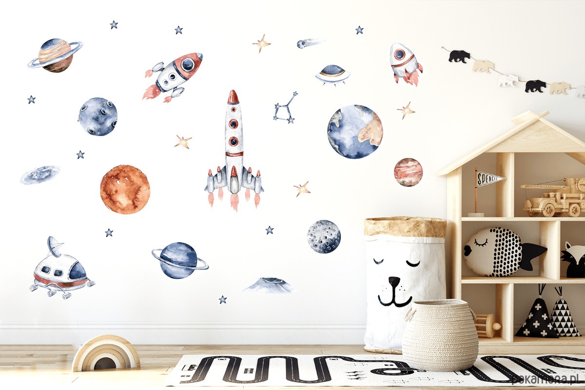 Planety, rakiety i konstelacje w delikatnych, akwarelowych odcieniach przeniosą malucha w niezwykły świat galaktyk, a wnętrze pokoju stanie się miejscem niekończących się zabaw i historii. 🌍☄️
