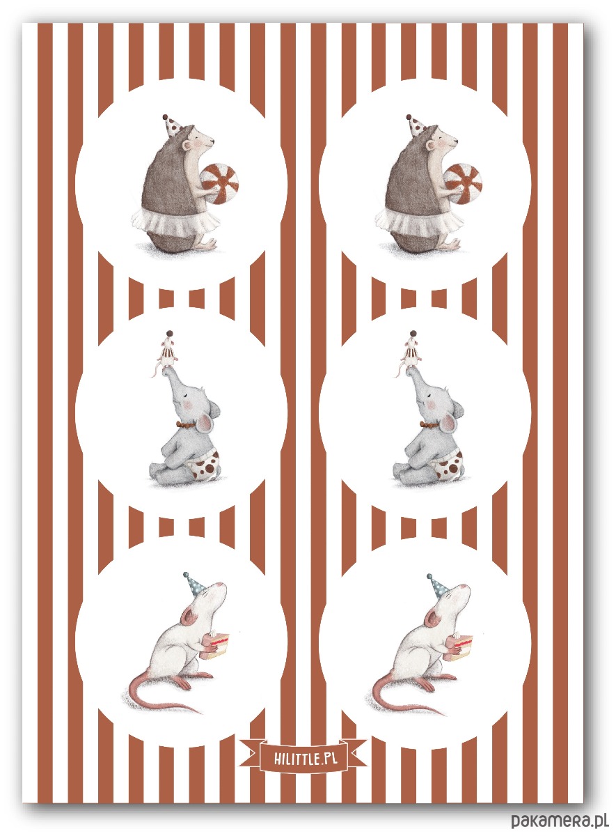 Komplet 6 naklejek urodzinowych ze zwierzątkami: jeżem, słonikiem i myszką.