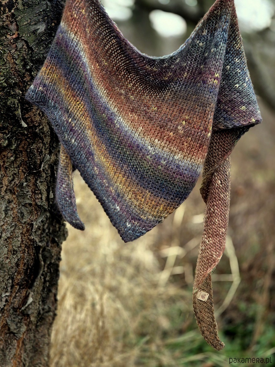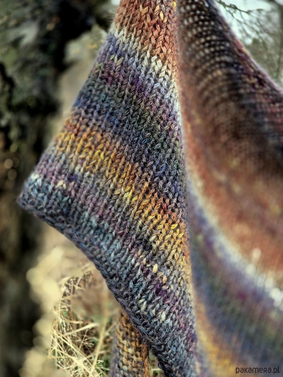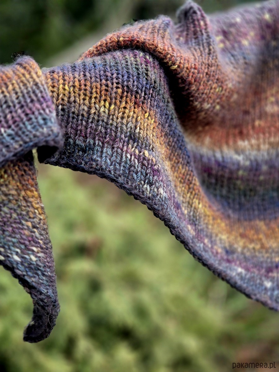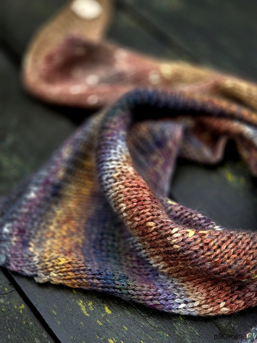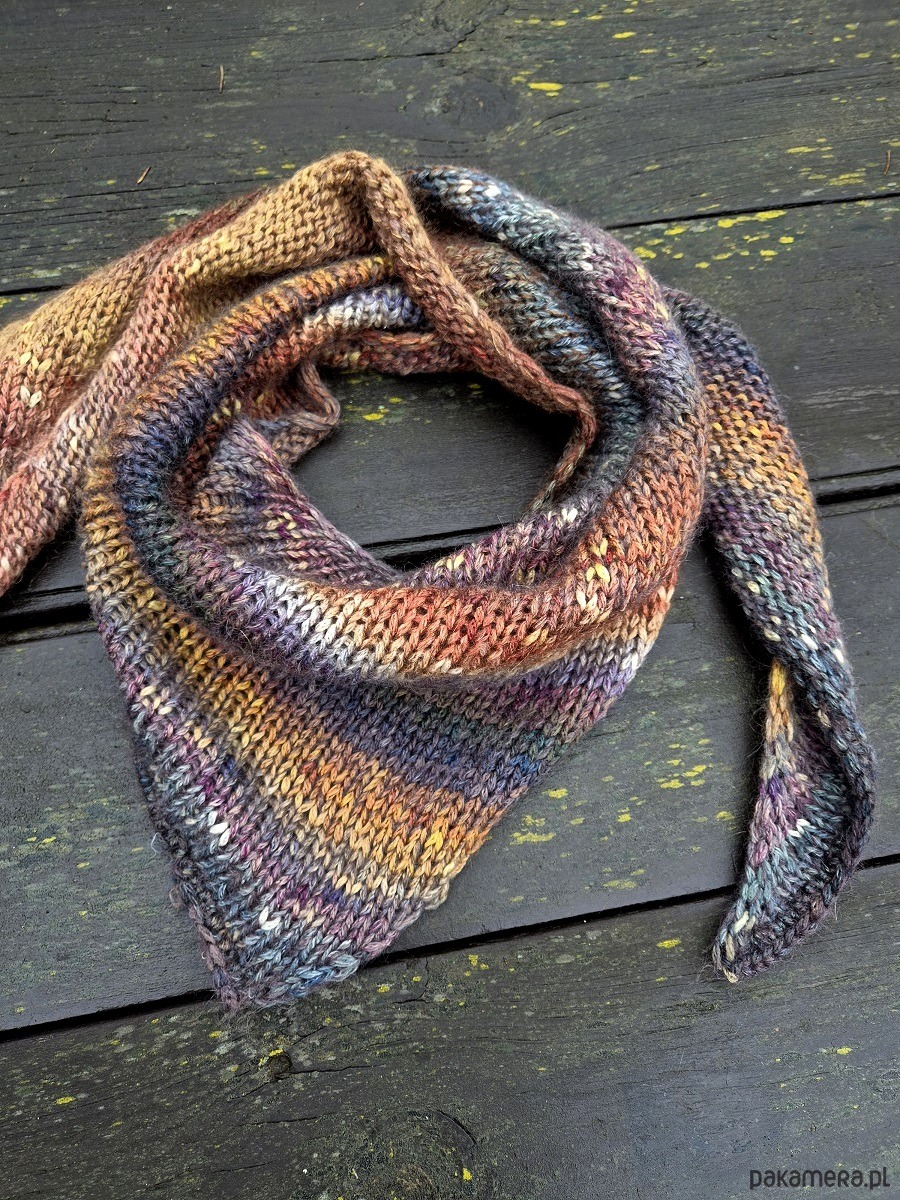 Niezwykle miękki, lejący szal/ chustka w kształcie kopniętego trójkąta. Wykonany ręcznie na drutach z mięciutkiej, pięknej włóczki o splocie łańcuszkowym- świetna jakość połączonej z cienką włóczką moherowo- jedwabną. Wielkość idealna do otulenia szyi.