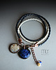 Efektowna bransoletka wykonana z rzemienia jubilerskiego w kolorze granatowym i ecru elementów w kolorze miedzianym i ręcznie wykonanych ceramicznych zawieszek, szkliwionych mieszanką kremowo brunatnych i błękitno zielonych szkliw z efektem plamek o subtelnym połysku, Obwód regulowany. Polecam