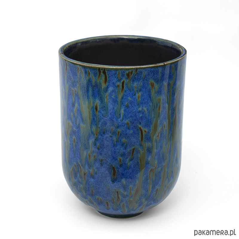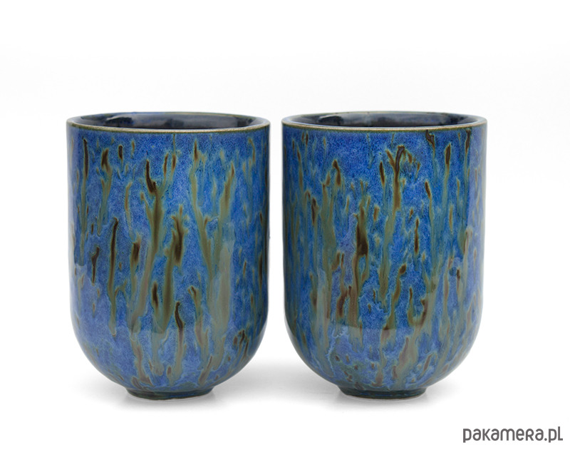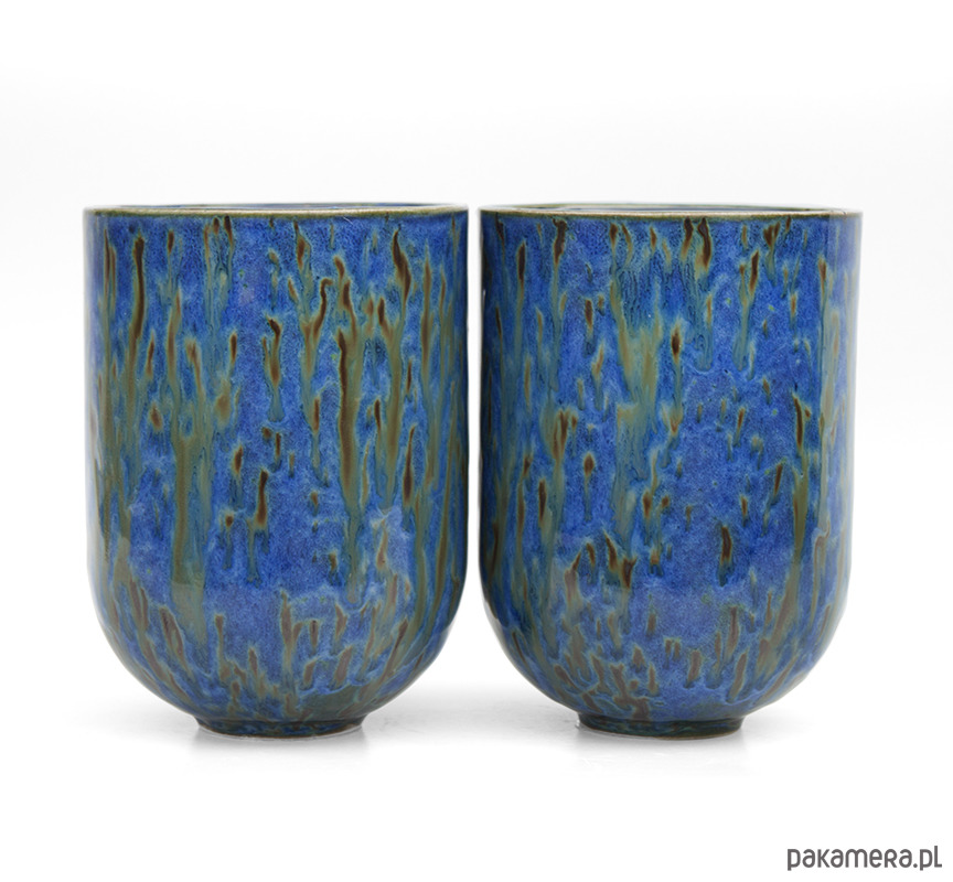 Dwa ceramiczne kubki wykonane z mocno spieczonej kamionki, szkliwione efektowną mieszanką błękitnych i zielonych szkliw. Wymiary: wysokość ok.12cm, średnica ok.8,5cm - wykonywane na zamówienie, rozmieszczenie kolorów może nieznacznie różnić się od widocznego na zdjęciu, czas realizacji około 5-10dni roboczych