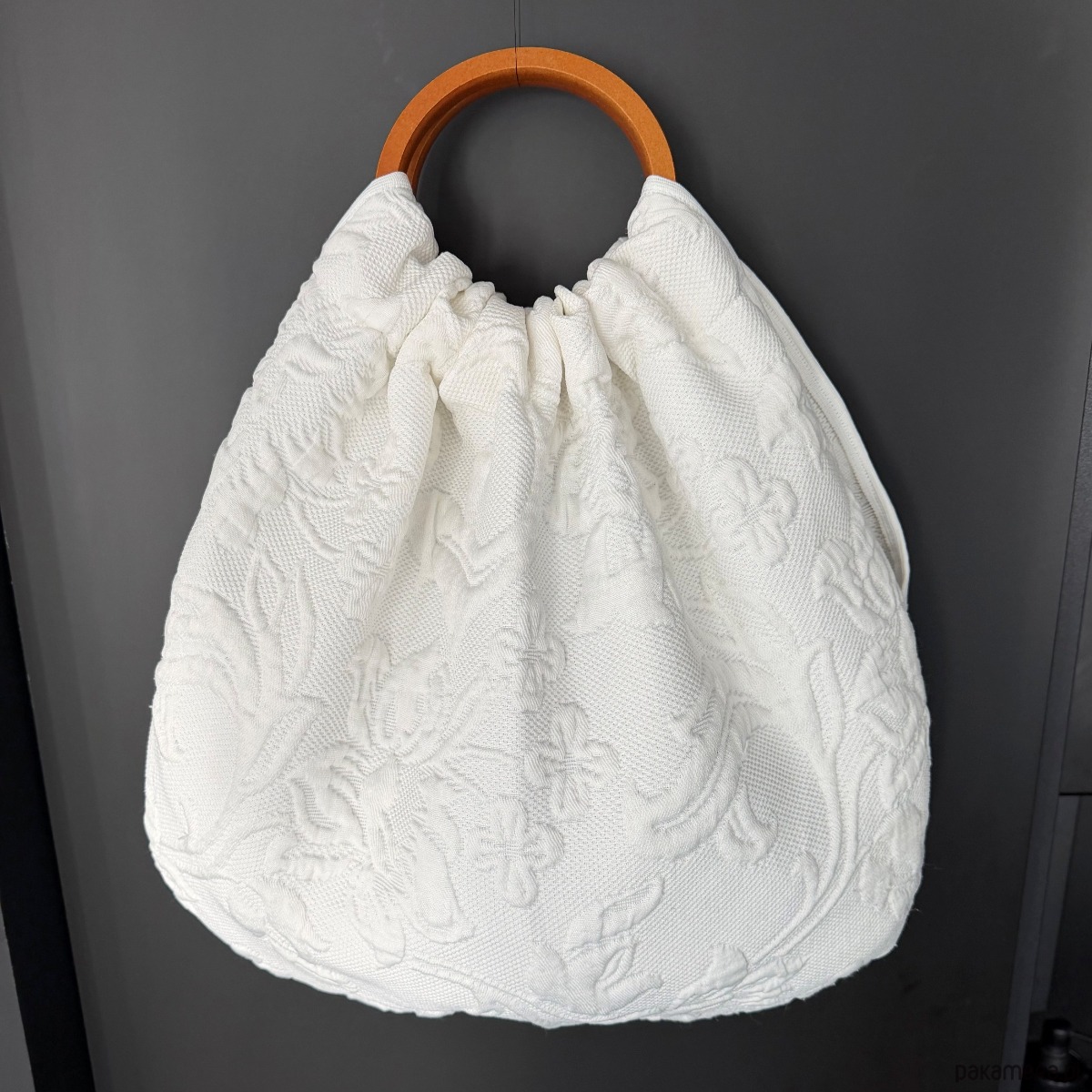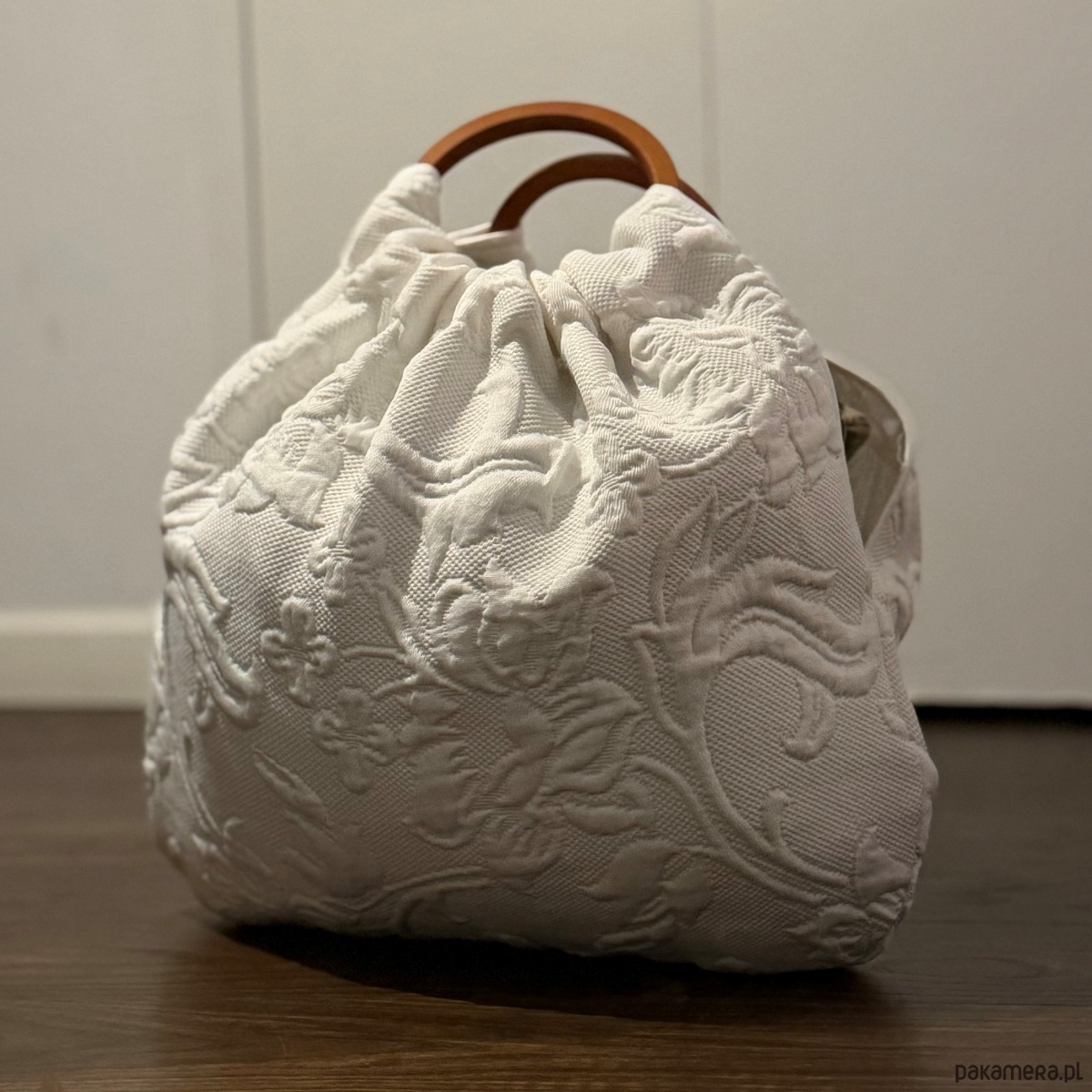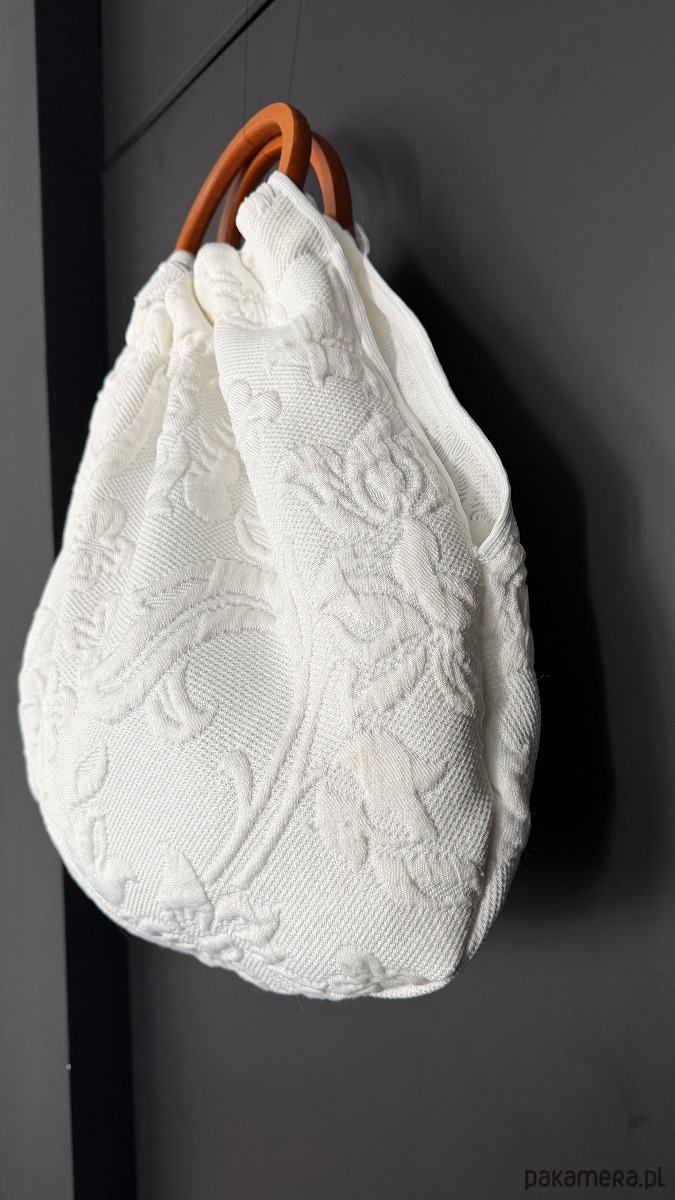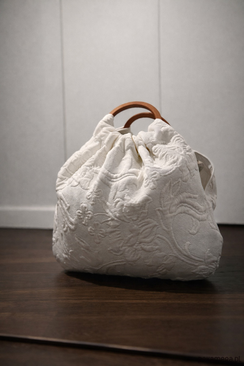 Marszczona konstrukcja buduje naturalną objętość, a drewniana rączka nadaje całości równowagę i kontrolę.