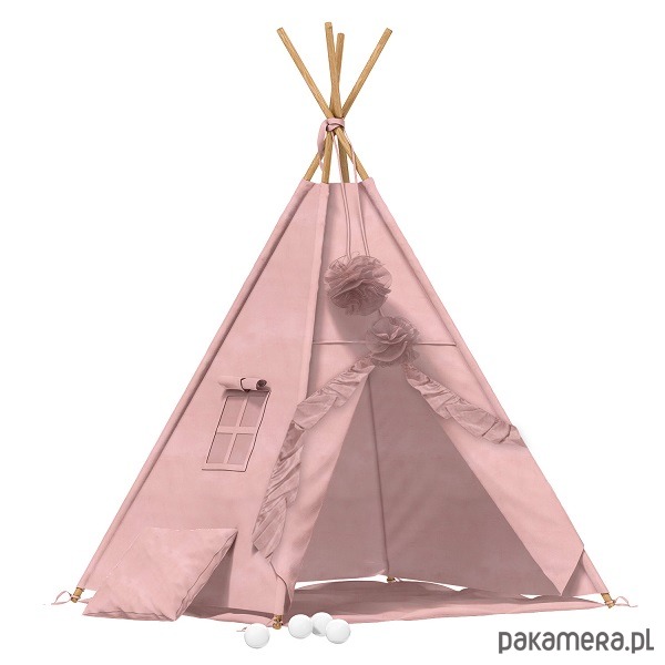 Namiot tipi na drewnianym stelażu, idealna dekoracja dziecięcego pokoju.Wymiary podstawy 110 x 110 cmWysokość ze stelażem około 180 cmMata w zestawie w takim samym wzorze i kolorze jak tipi!Poduszki do kupienia osobno w naszym sklepie.Namiot nie zawiera pomponów widocznych na zdjęciu