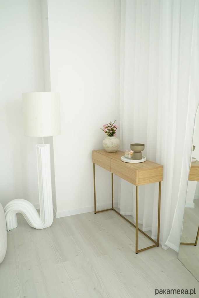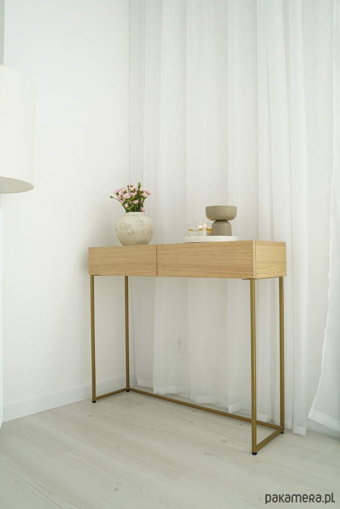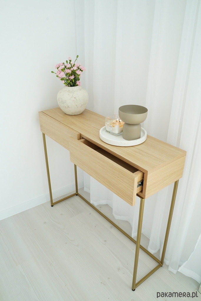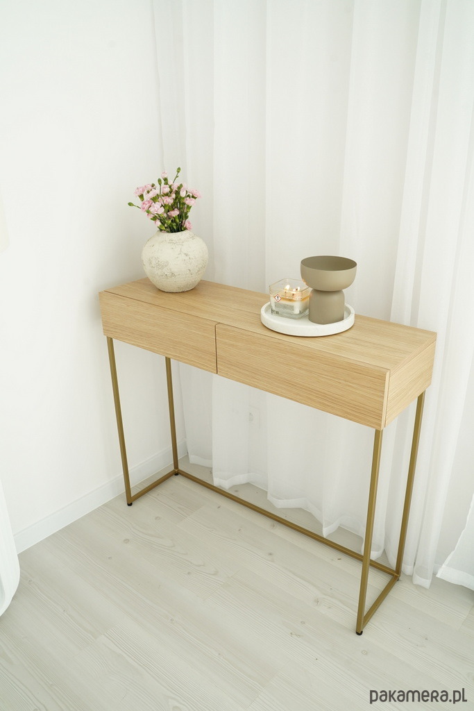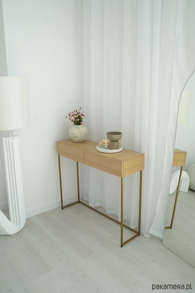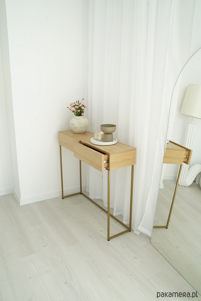 Toaletkę można umieścić we wnętrzach eleganckich i klasycznych. Konsola wykonana jest z naturalnego forniru lakierowanego. Matowe wykończenie sprawia, że całość wyróżnia się designerskim urokiem. Stelaż to klasyczna, a zarazem innowacyjna forma, która pomalowana jest proszkowo na złoto. Toaletka wyposażona jest w dwie szuflady otwierane poprzez tip on. W szufladach można z powodzeniem pomieścić różnego rodzaju drobiazgi i akcesoria. Na blacie znajduje się miejsce na lustro, a także liczne ozdoby.