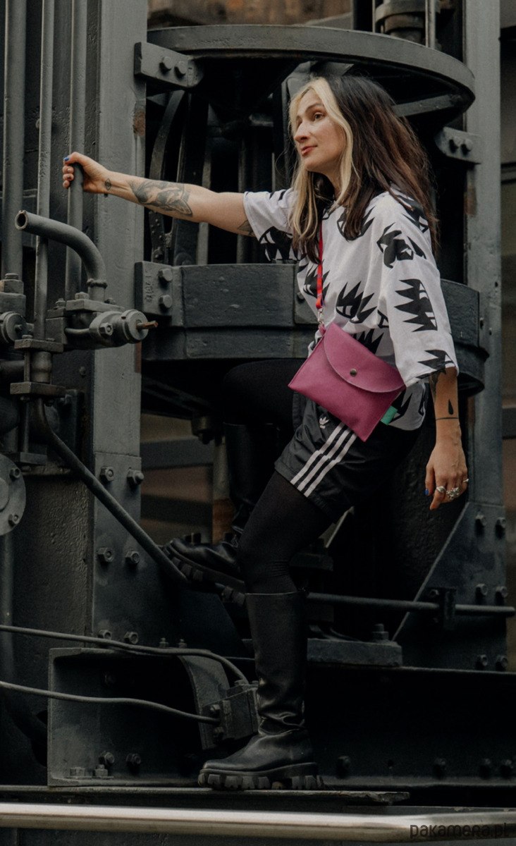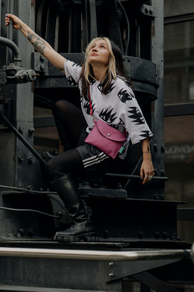 Naposzetka w fuksjowym kolorze, wykonana z wysokiej jakości materiałów wodoodpornych i wegańskich. Posiada w środku podszewkę oraz jedną przegrodę. Całość zapinana na metalowy nap. Po bokach posiada dwa metalowe karabińczyki na które zapinany jest pasek, który można wymieniać na inne kolory lub na inne wzory.