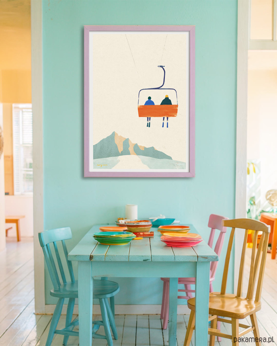 Plakat „Narty w górach - wyciąg narciarski” to idealna zimowa dekoracja domu dla wszystkich kochających sporty zimowe. Zima ma w sobie tą specyficzną energię, która sprawia, że każdy słoneczny dzień chce się wykorzystać w całości. Prosta kreska i minimalistyczne kolory podkreślają zimową przemianę krajobrazu w niemal magiczne miejsce.