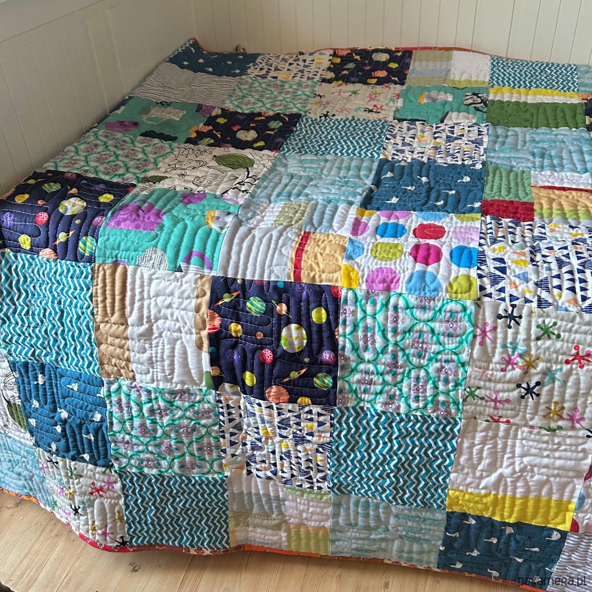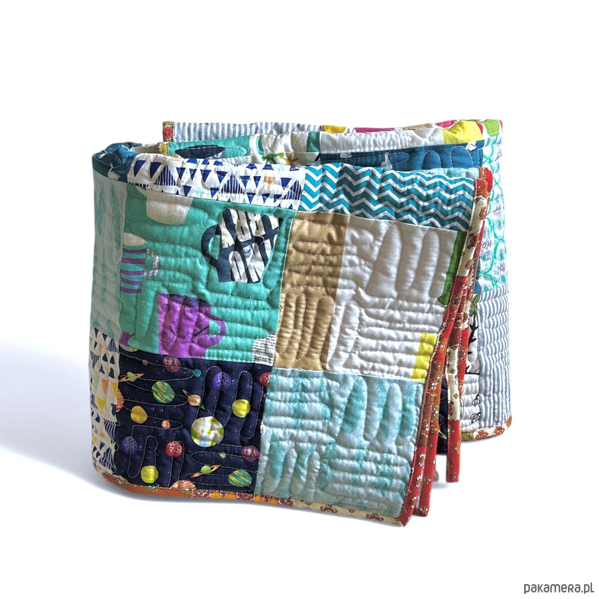 - Wzór: kompozycja kolorowych kwadratów, wykonana z oryginalnych, amerykańskich tkanin patchworkowych.
