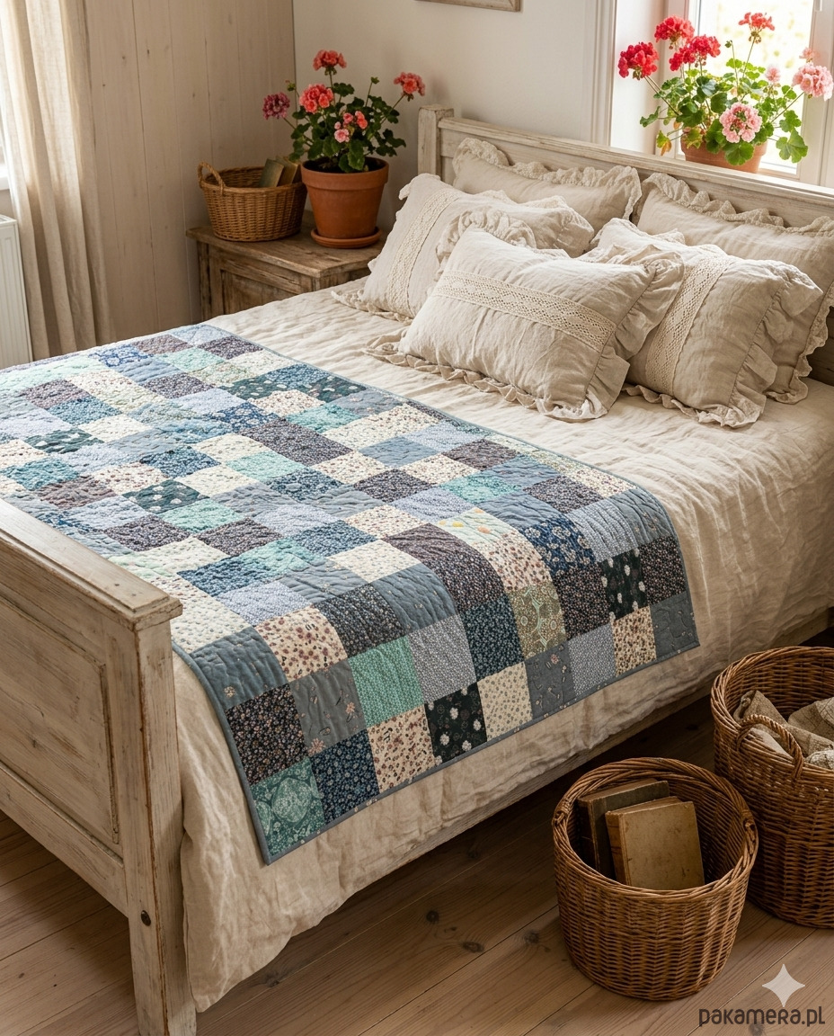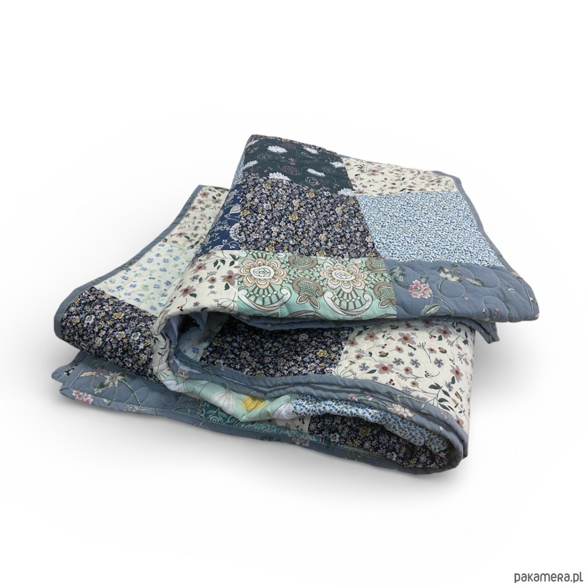 Narzuta patchworkowa Florall - piękne połączenie kwiatowych wzorów w delikatnej i chłodnej kolorystyce.