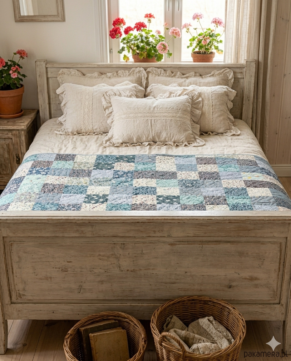 Narzuta jest wypełniona lekką i ciepłą włókniną lateksową, pikowana fantazyjnie z wolnej ręki przez trzy warstwy. Spód narzuty patchworkowy z tkanin tak dobranych, aby mogła służyć jako narzuta dwustronna.