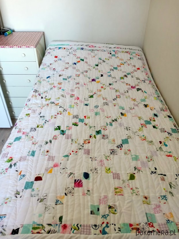 Niezwykle subtelna, delikatna , uszyta z maleńkich kwadratów - 3,7 cm, z białym tłem . Wszystkie tkaniny to bawełna. Znakomita większość to bawełna patchworkowa prod. USA. Spód również z bawełny w delikatny wzór dmuchawców.