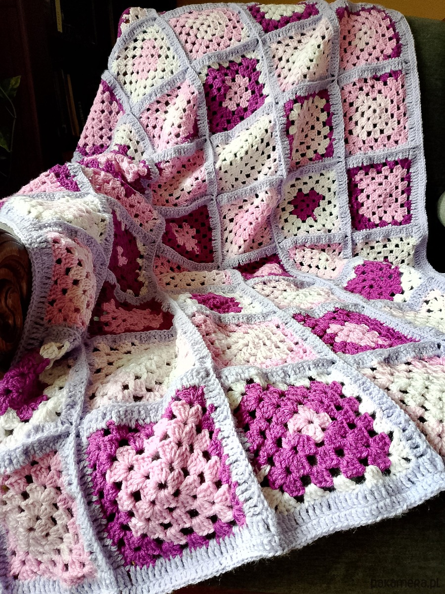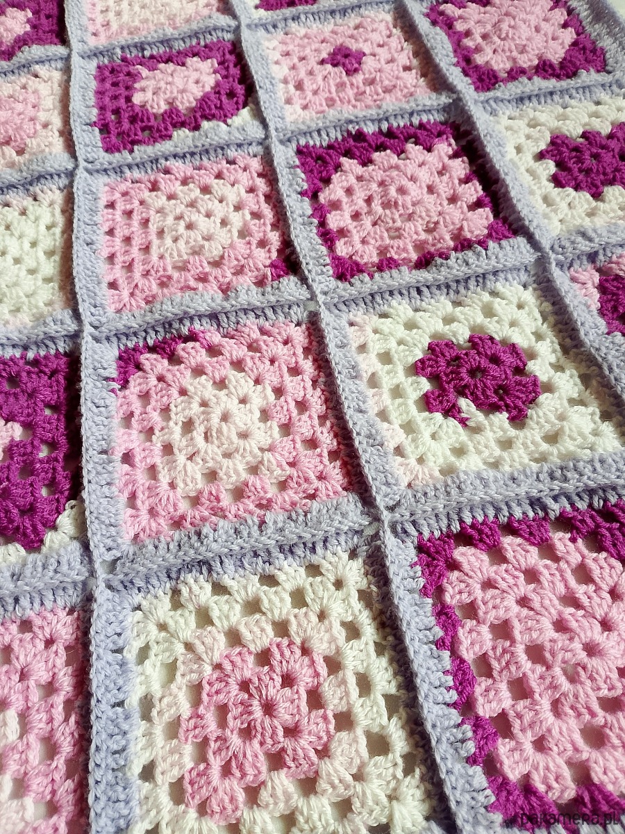 Narzuta w całości wykonana ręcznie z małych kwadratów. Wymiary 135 cm x 95 cm.