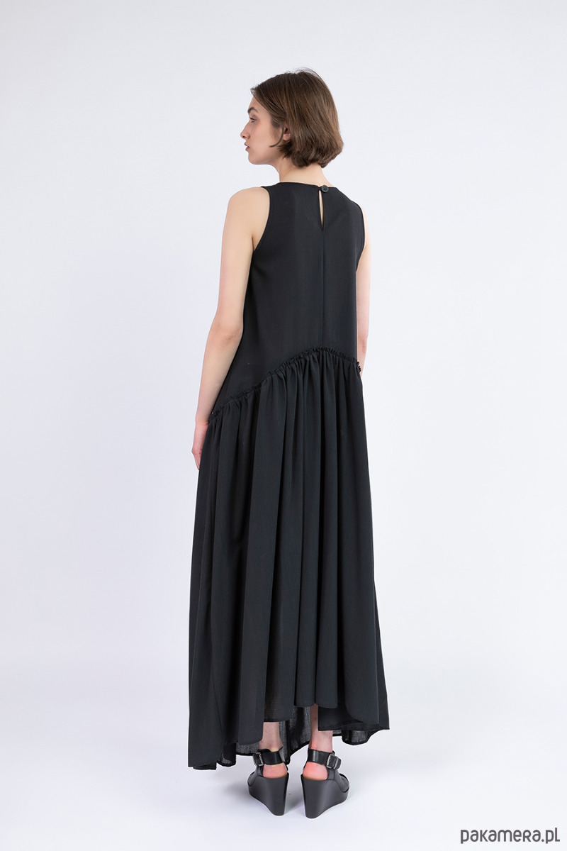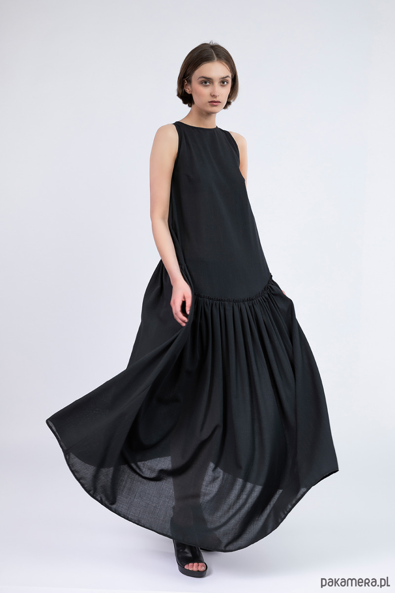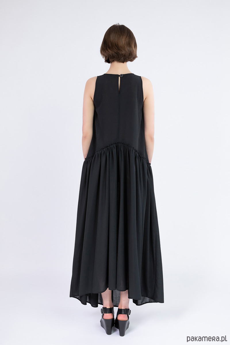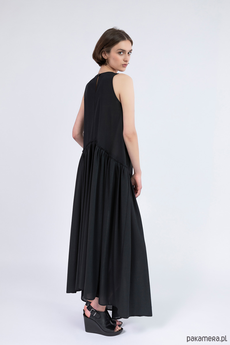 sukiena uszyta ze lnu lub z bawełny cienkiej z elastanem, z dekoracyjną falbaną szeroką wszyta ukośnie,