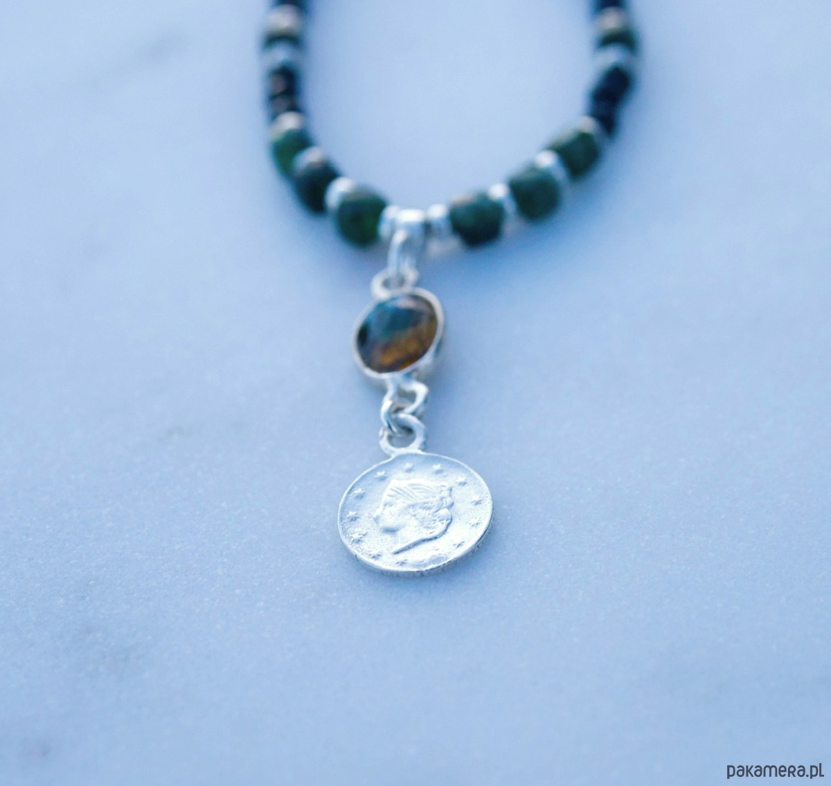 Delikatny, nastrojowy naszyjnik z czarnego i zielonego turmalinu. Ciekawe połączenie ciemnej, butelkowej zieleni z czernią daje efekt subtelnego przełamania, przyciąga wzrok, intryguje. W zawieszce znajduje się bogato ubarwiony labradoryt imoneta z królową Elżbietą II.
