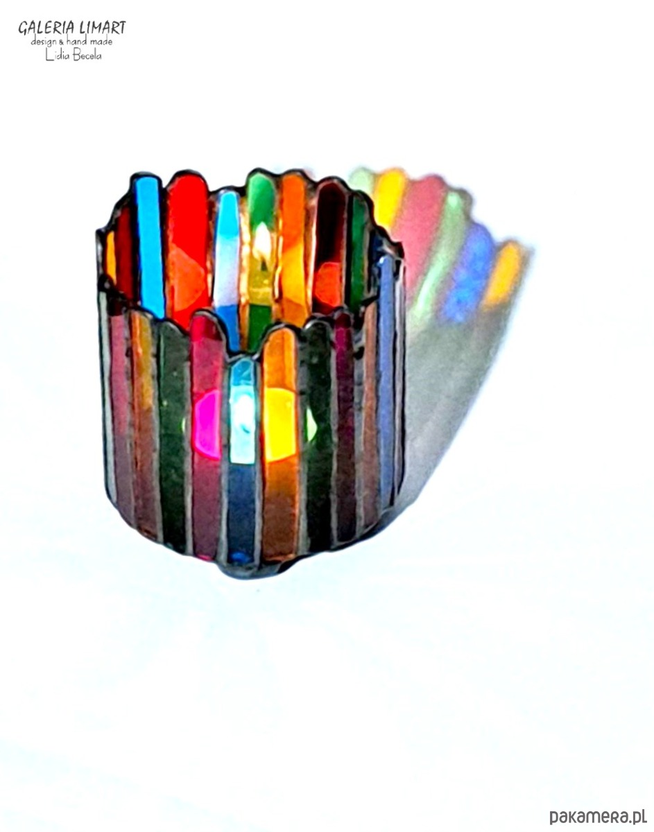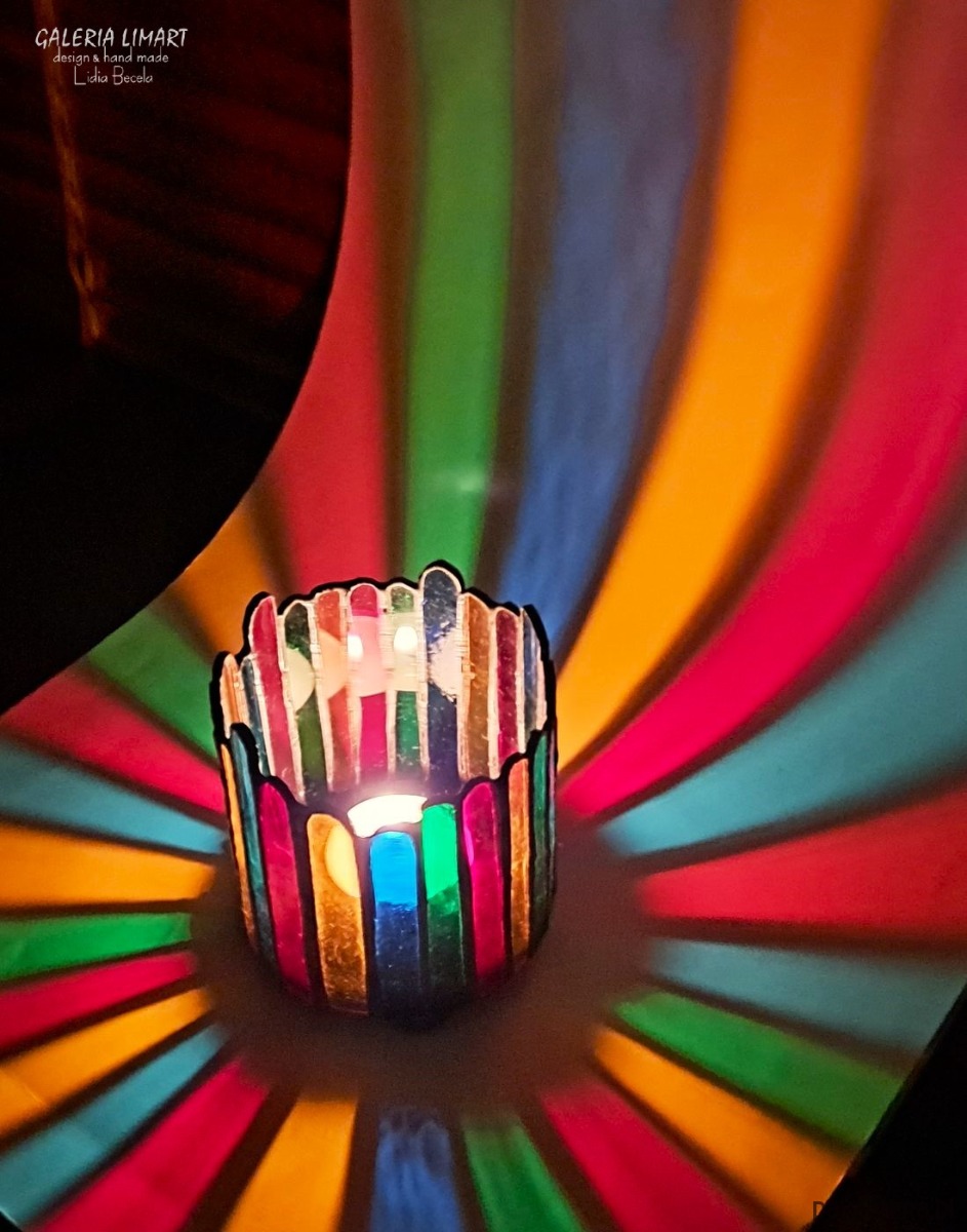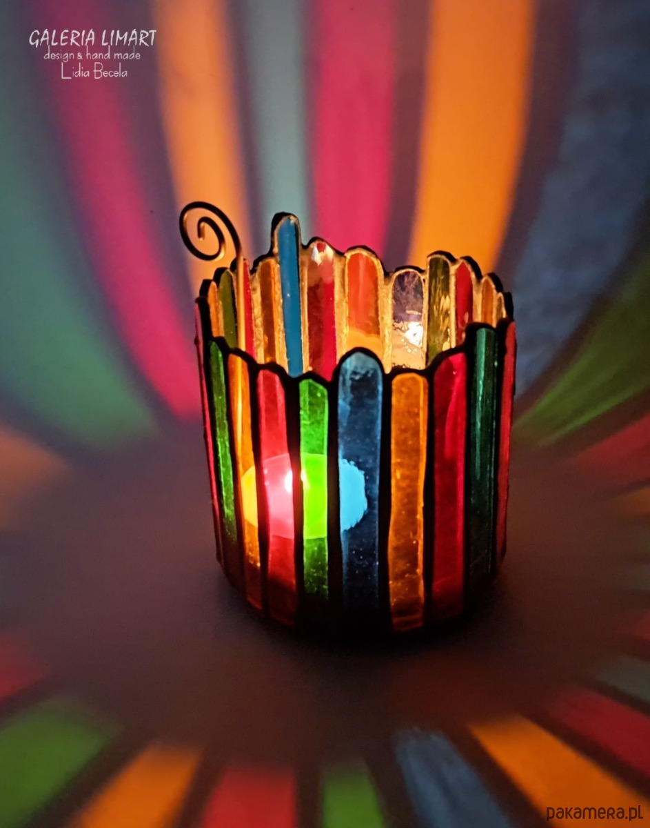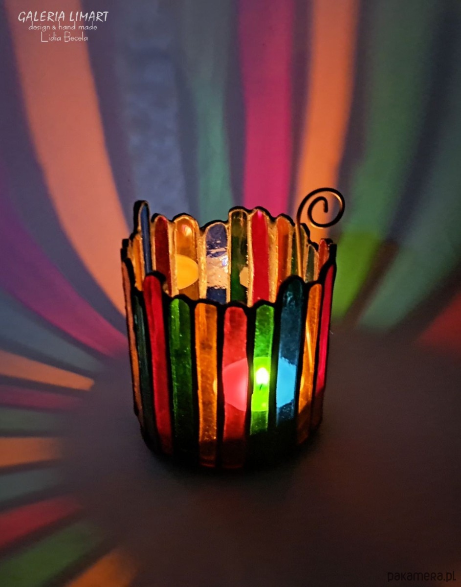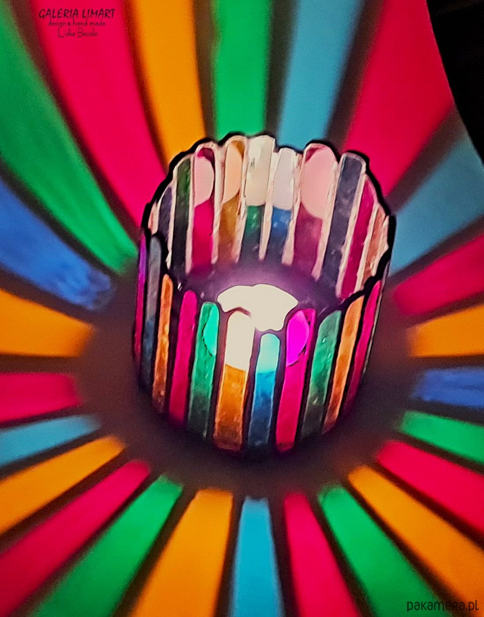 Autorski lampion z mnóstwa szklanych paseczków katedralnego szkła witrażowego w bajecznej palecie barw. Podświetlony wygląda niesamowicie, rzuca dookoła urocze, wręcz magiczne odblaski, które robią niezwykłe niemal hipnotyzujące wrażenie. Jest rewelacyjnie kolorowy i ogromnie efektowny!
