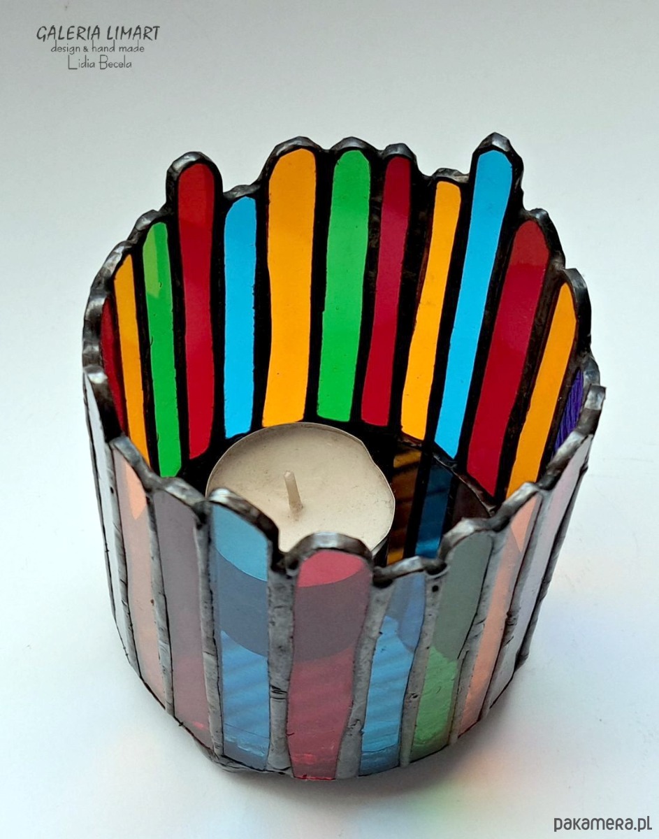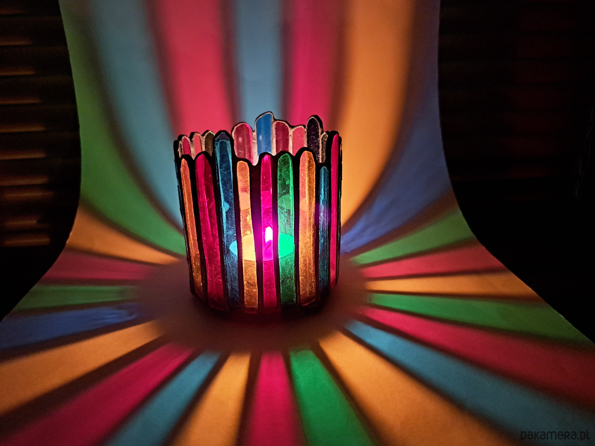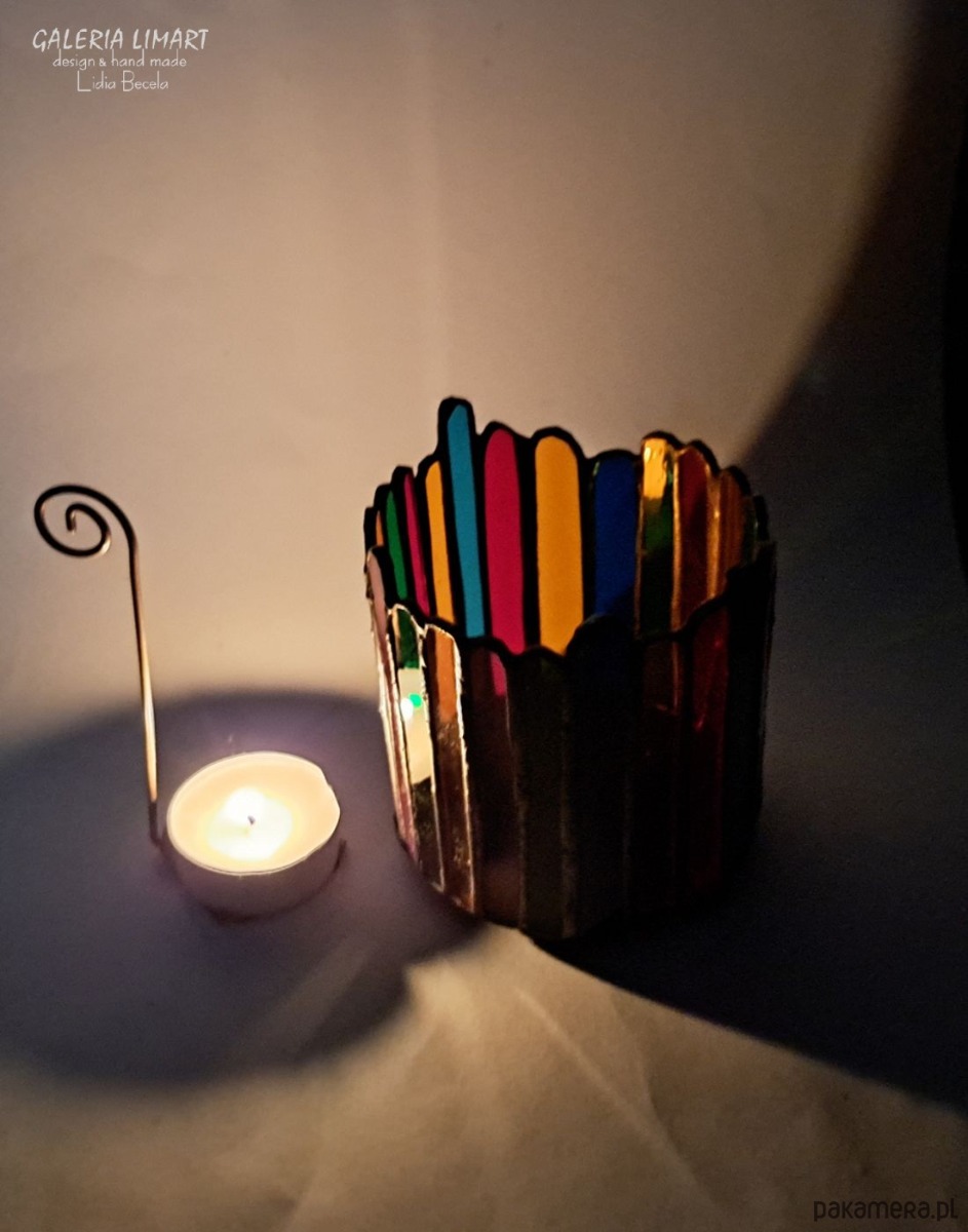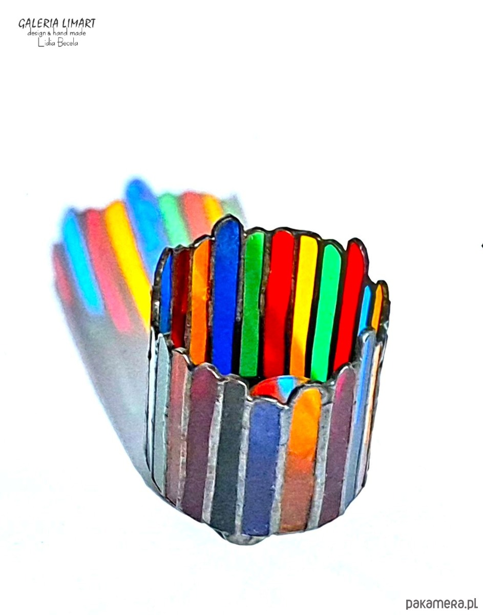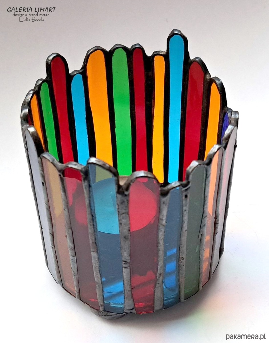 Autorski lampion z mnóstwa szklanych paseczków katedralnego szkła witrażowego w bajecznej palecie barw. Podświetlony wygląda niesamowicie, rzuca dookoła urocze, wręcz magiczne odblaski, które robią niezwykłe niemal hipnotyzujące wrażenie. Jest rewelacyjnie kolorowy i ogromnie efektowny!