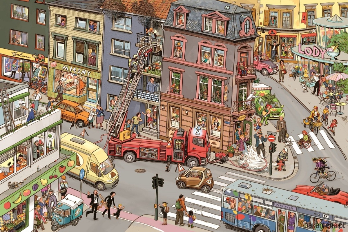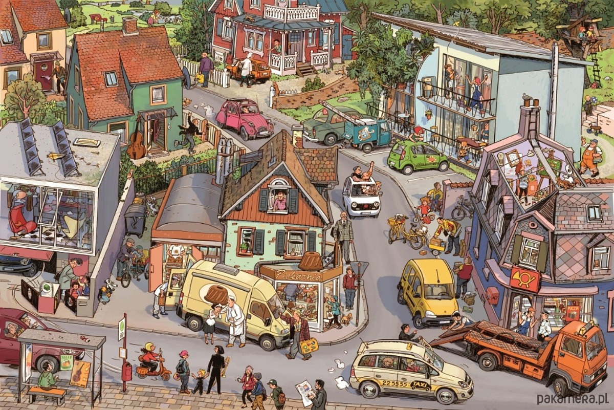 Zobaczcie, co dzieje się w miasteczku, szukajcie szczegółów, podążajcie za postaciami. Co robi architekt Ludwik, czym zajmuje się strażaczka Patrycja i kogo spotyka lekarka Irena. W tej kartonowej książce bez tekstu można ćwiczyć koncentrację, spostrzegawczość i uczyć się opowiadania.