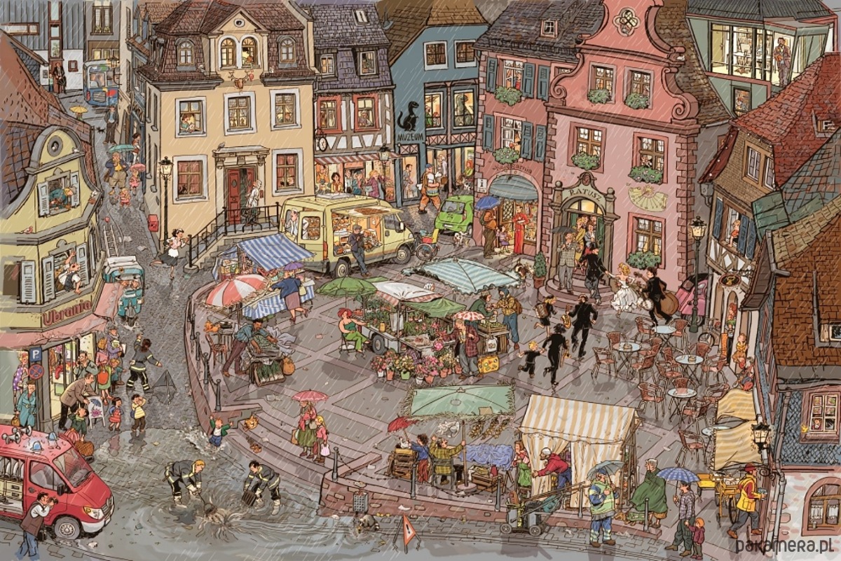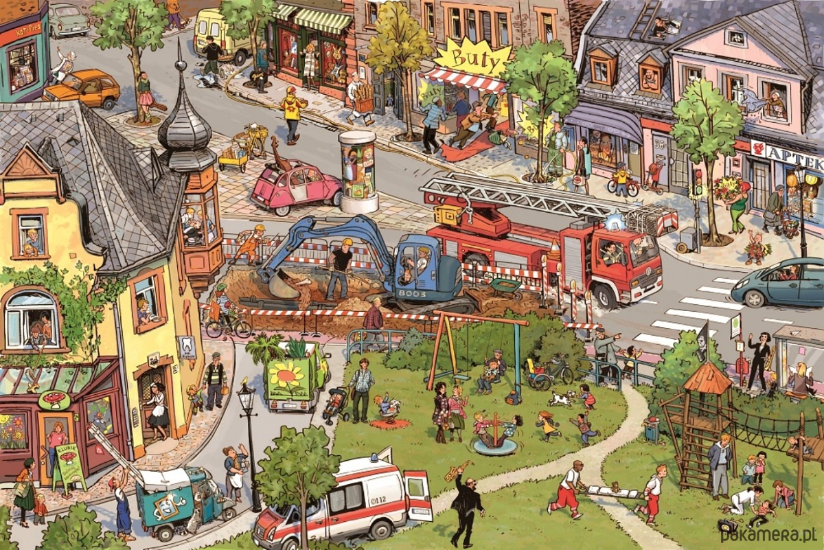 Tylko zobaczcie, jak wiele się dzieje w naszym miasteczku! Strażacy wyjeżdżają z nagłą interwencją, ratownicy z pogotowia pędzą z pomocą do wypadku, zaraz obok laweta zabiera zepsute auto. Rowerowy kurier spieszy się z pilną przesyłką, a listonosz rozwozi większe paczki. Ale to miasteczko żyje nie tylko pracą! Na placu zabaw bawią się dzieci, przed ratuszem klaun pokazuje swoje sztuczki, a młoda para tańczy do muzyki granej na żywo... Zapraszamy do naszego zapracowanego i pełnego życia miasteczka!