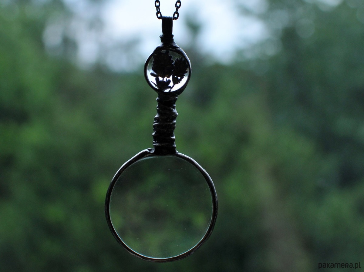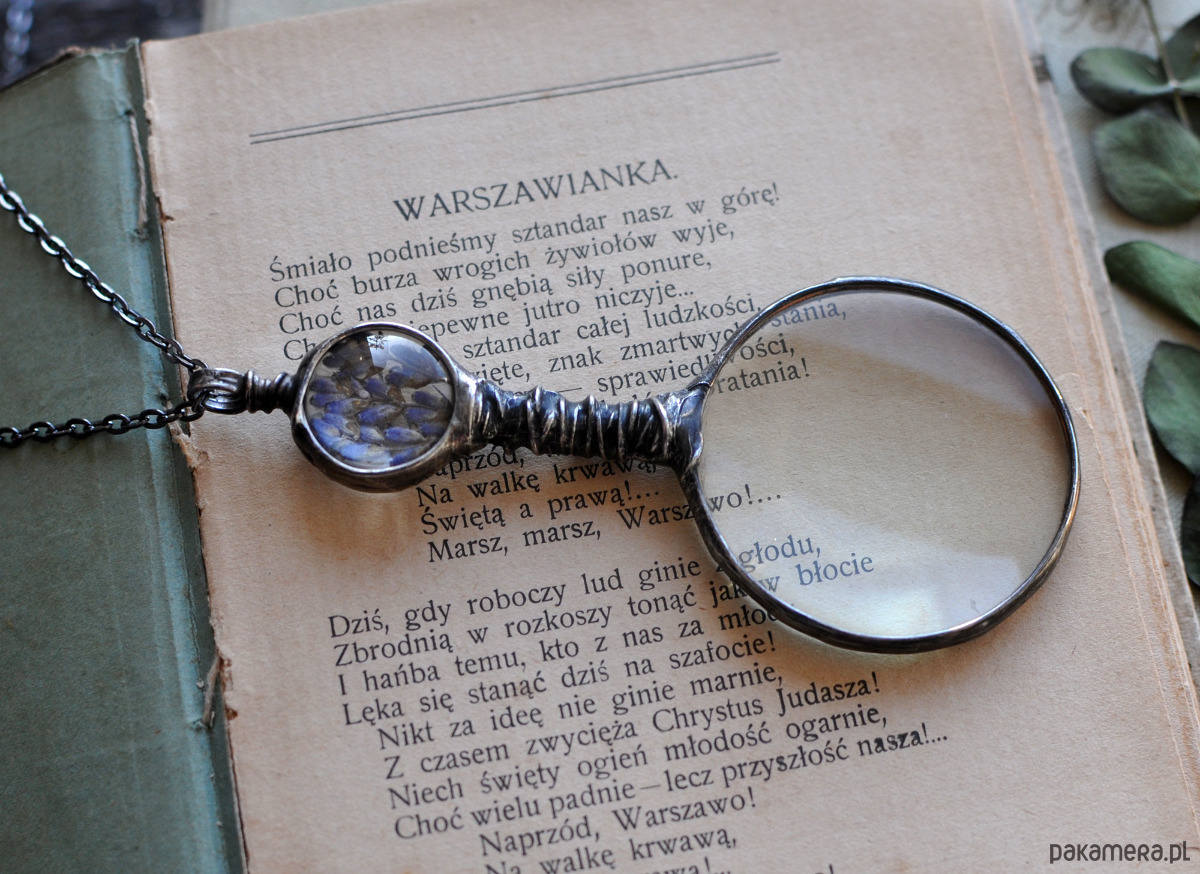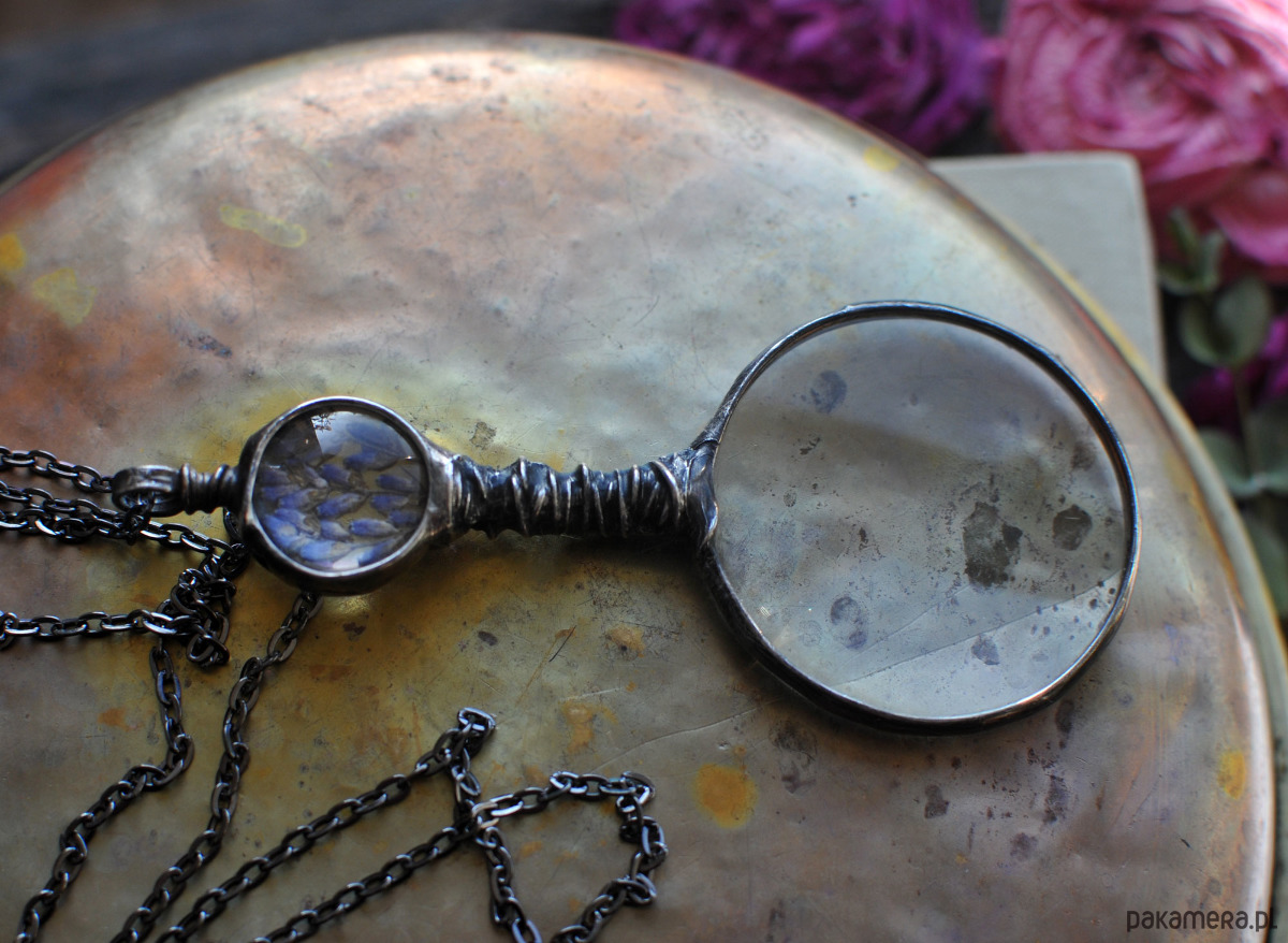 Uroczy naszyjnik z prawdziwym szkłem powiększającym, ozdobiony suszonymi kwiatami, zamkniętymi w szklanym oczku.