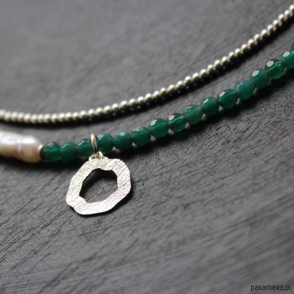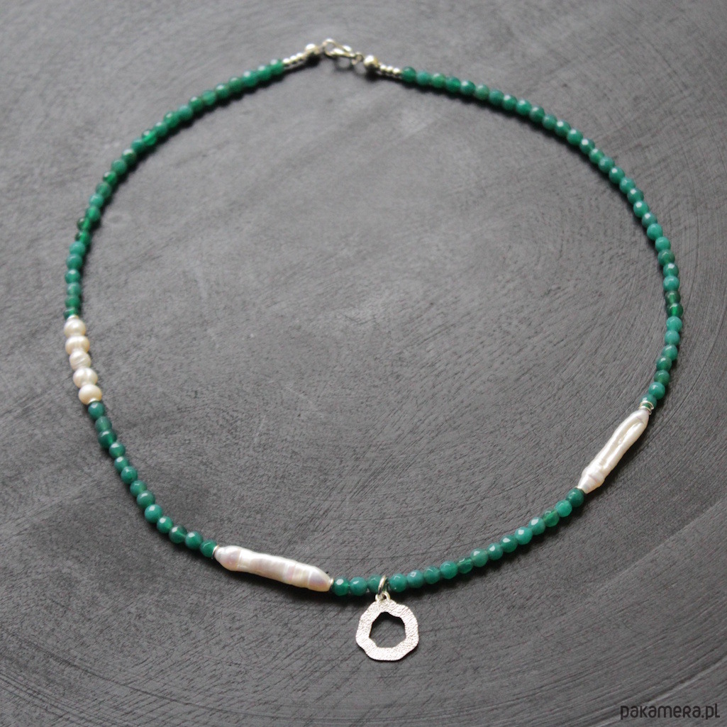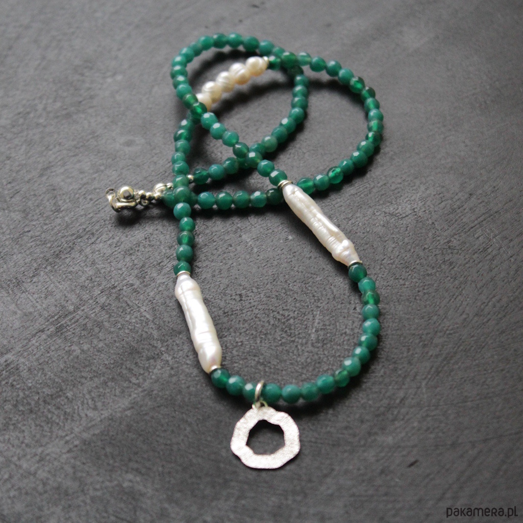 Naszyjnik został wykonany ze srebra próby 925 oraz fasetowanych zielonych onyksów wielkości 0,3 cm w towarzystwie białych pereł naturalnych hodowlanych długości 3 cm oraz 0,5 cm.