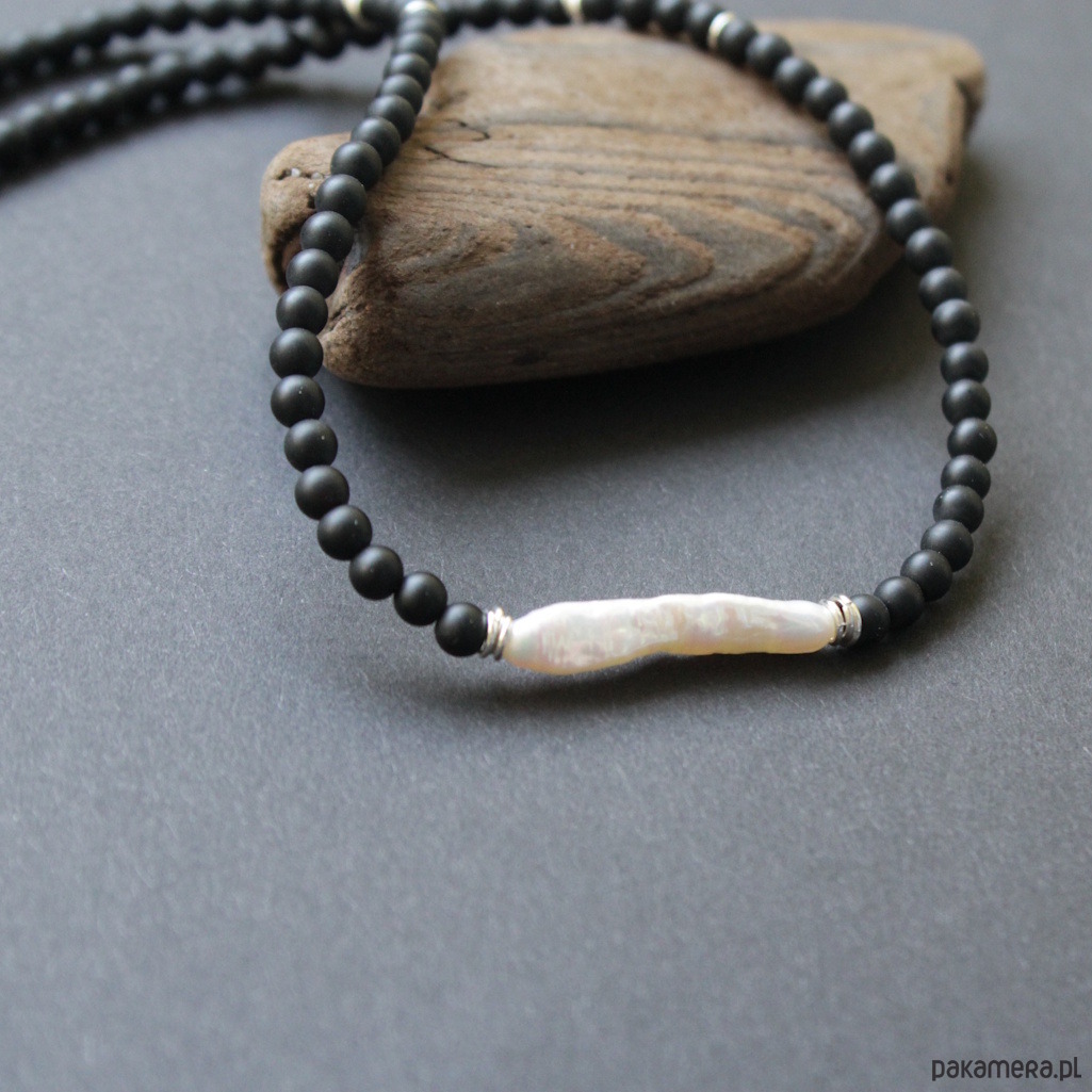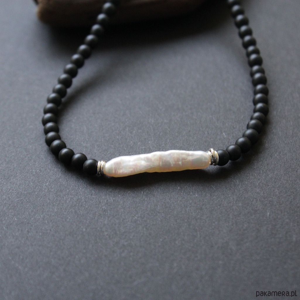 Naszyjnik został wykonany ze srebra próby 925 oraz pięknej naturalnej perły o długości 2,8 cm w towarzystwie czarnych matowych kuleczek onyksu wielkości 0,4 cm.