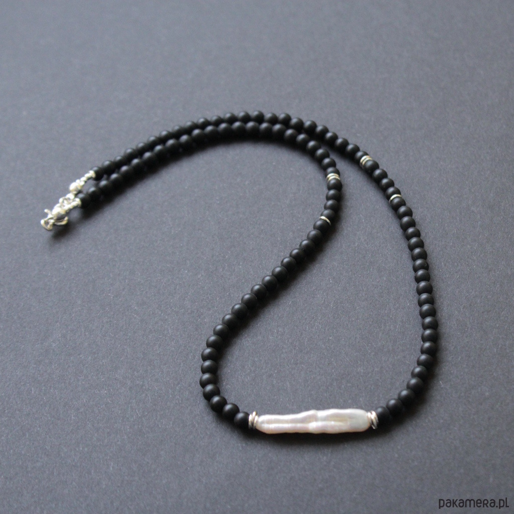 Naszyjnik został wykonany ze srebra próby 925 oraz pięknej naturalnej perły o długości 2,8 cm w towarzystwie czarnych matowych kuleczek onyksu wielkości 0,4 cm.