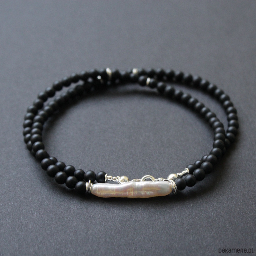 Naszyjnik został wykonany ze srebra próby 925 oraz pięknej naturalnej perły o długości 2,8 cm w towarzystwie czarnych matowych kuleczek onyksu wielkości 0,4 cm.