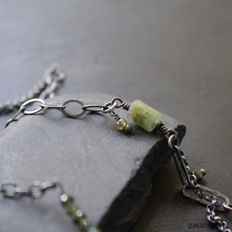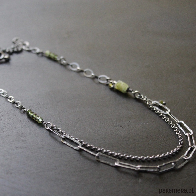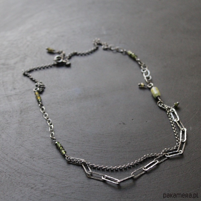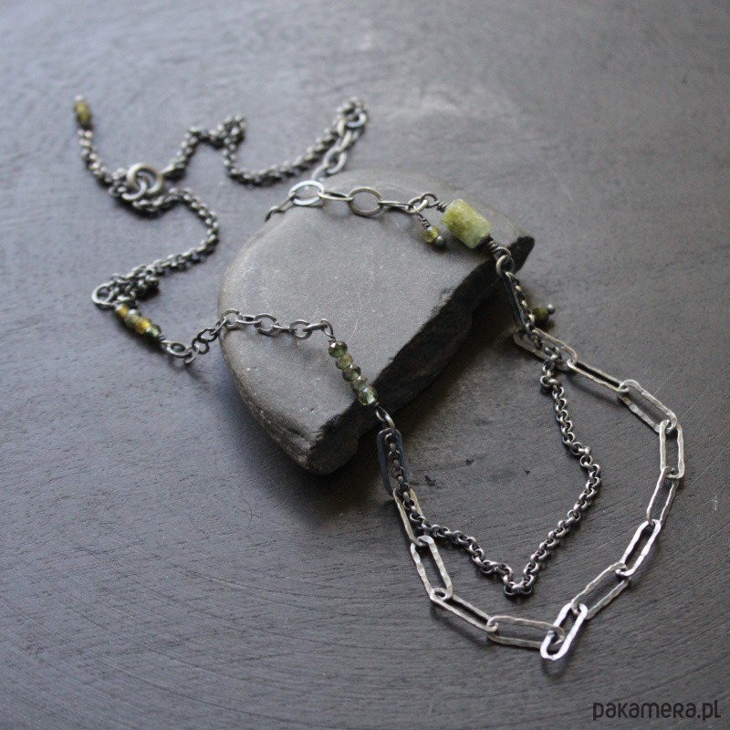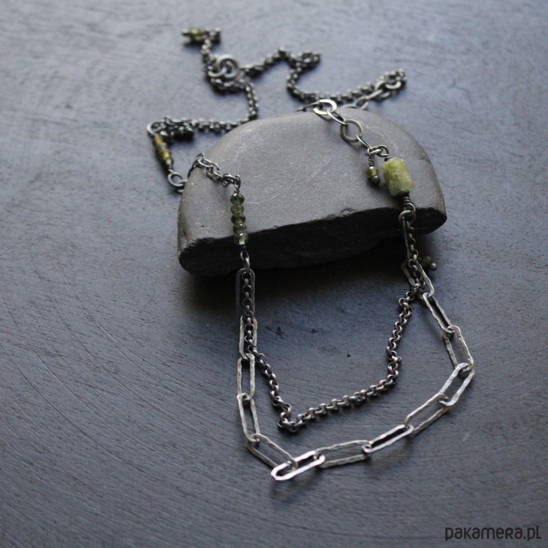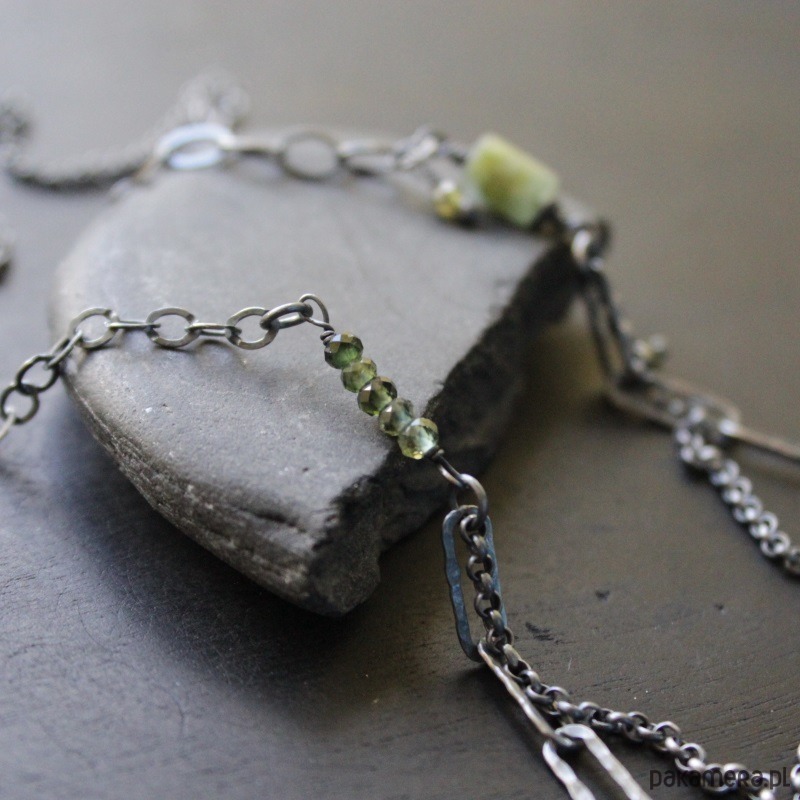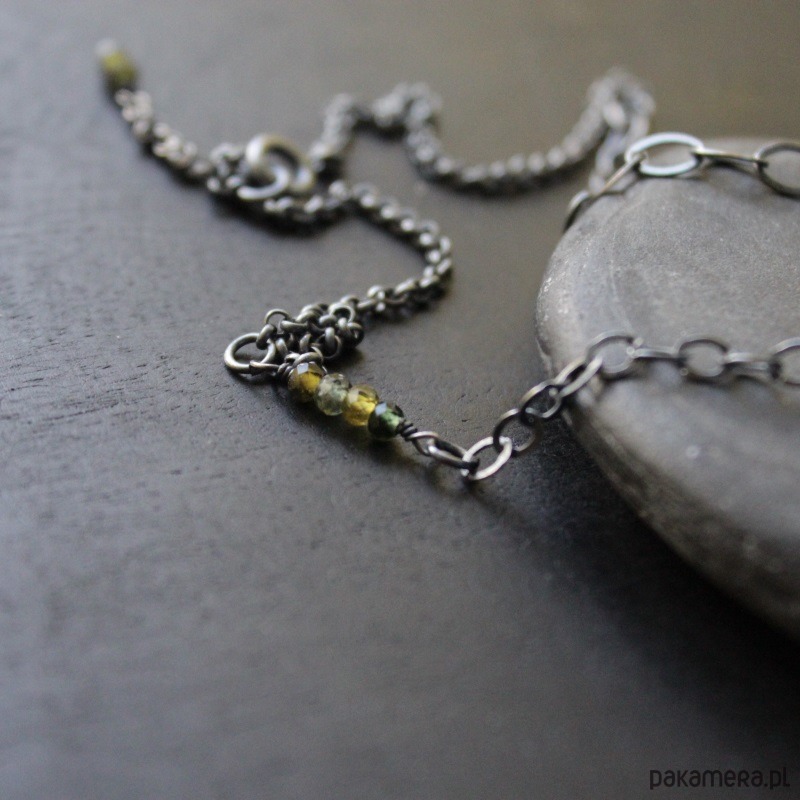 Naszyjnik z serii ze szkatułki babci, wykonany została z oksydowanego srebra próby 925 oraz fasetowanych turmalinów wielkości 0,3-0,7 cm.