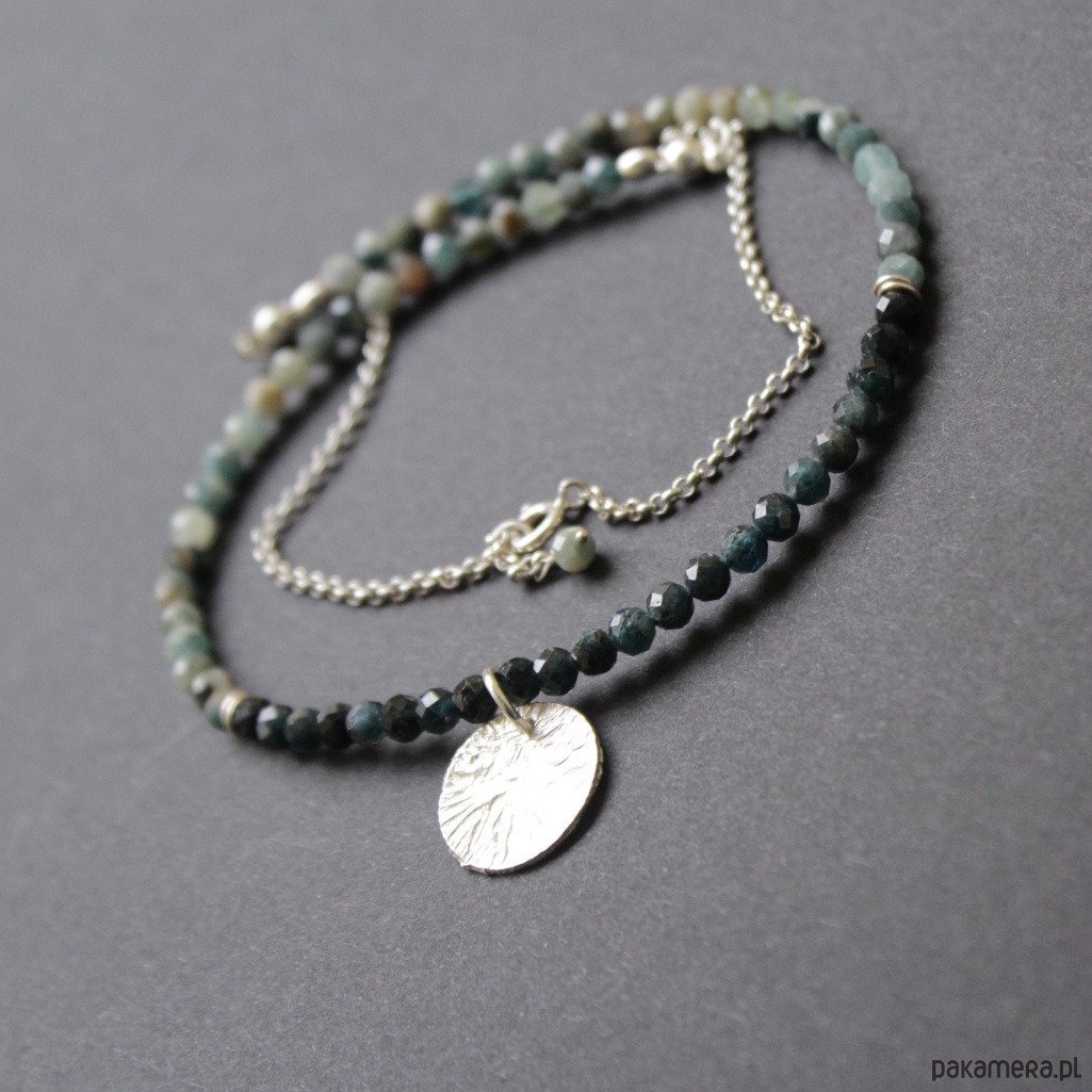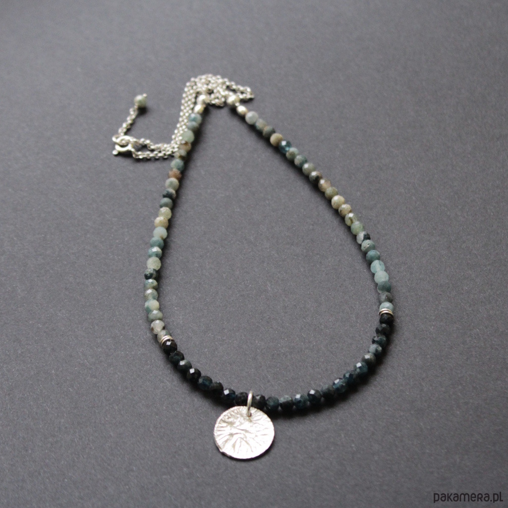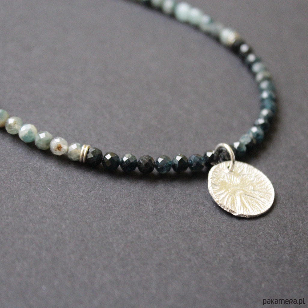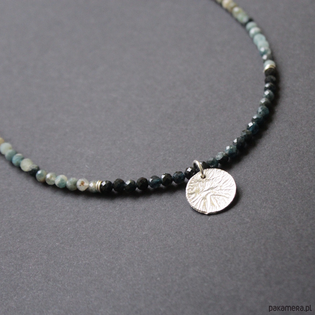Naszyjnik ozdobiony został srebrną młotkowaną blaszką o średnicy 1,5 cm.