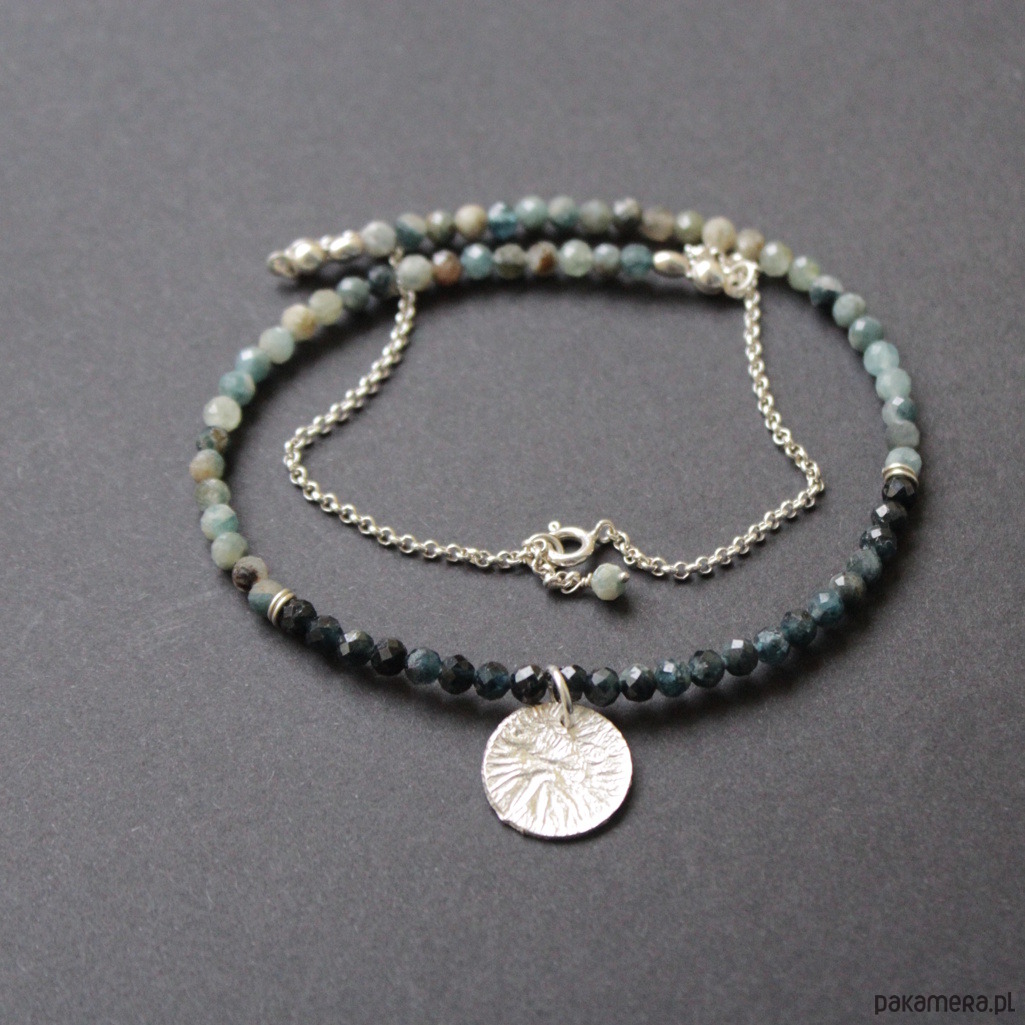 Naszyjnik ozdobiony został srebrną młotkowaną blaszką o średnicy 1,5 cm.