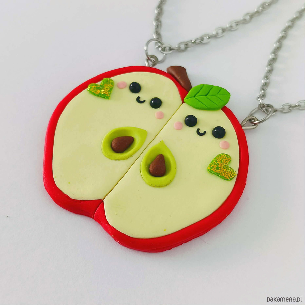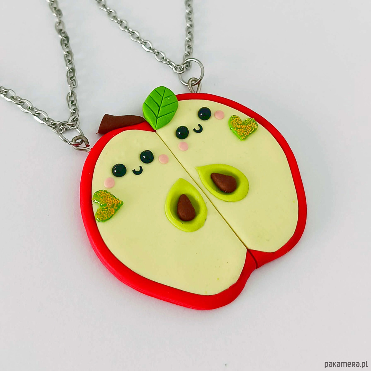 Ręcznie wykonany naszyjnik z masy polimerowej w kształcie jabłka podzielonego na dwie połówki. Każda z nich ma uroczą buzię, a razem tworzą jedną całość – słodko i z przymrużeniem oka