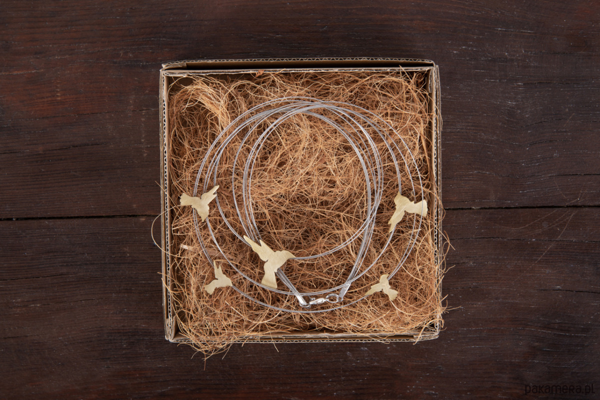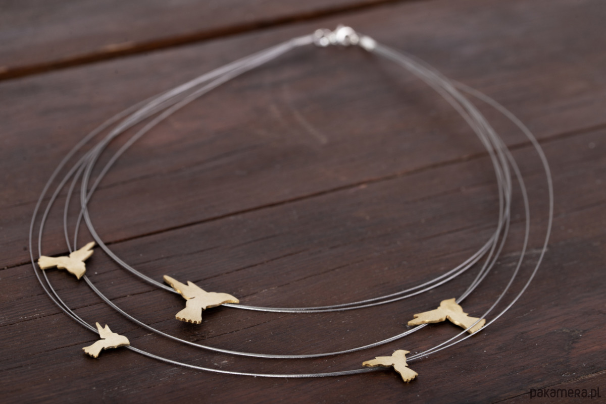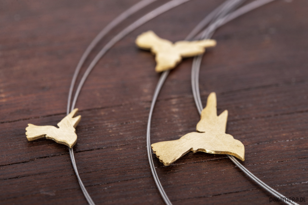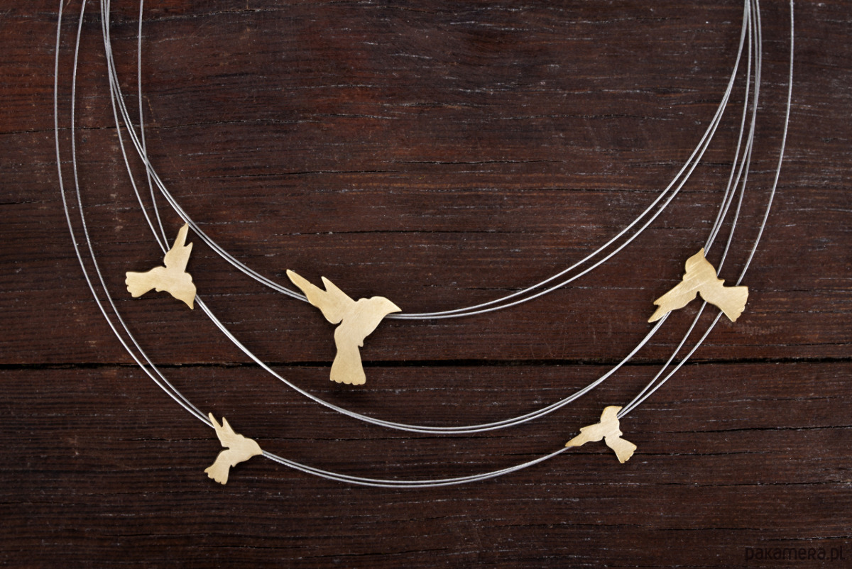 Naszyjnik z motywem kolibrów. Elementy wykonane z mosiądzu zawieszone na stalowych linkach. Elementy wielkości ok 1- 2,2 cm, linki długości 45-49 cm. Możliwość zamówienia dłuższego naszyjnika. Naszyjnik może nieznacznie różnić się od przedstawionego na zdjęciu