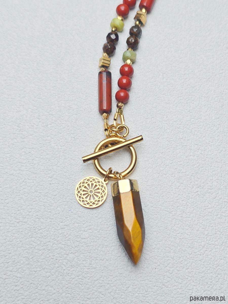 Wykorzystane kamienie: bronzyt, jaspis ceglasty, larkvit, peridot, tygrysie oko, złocony hematyt.