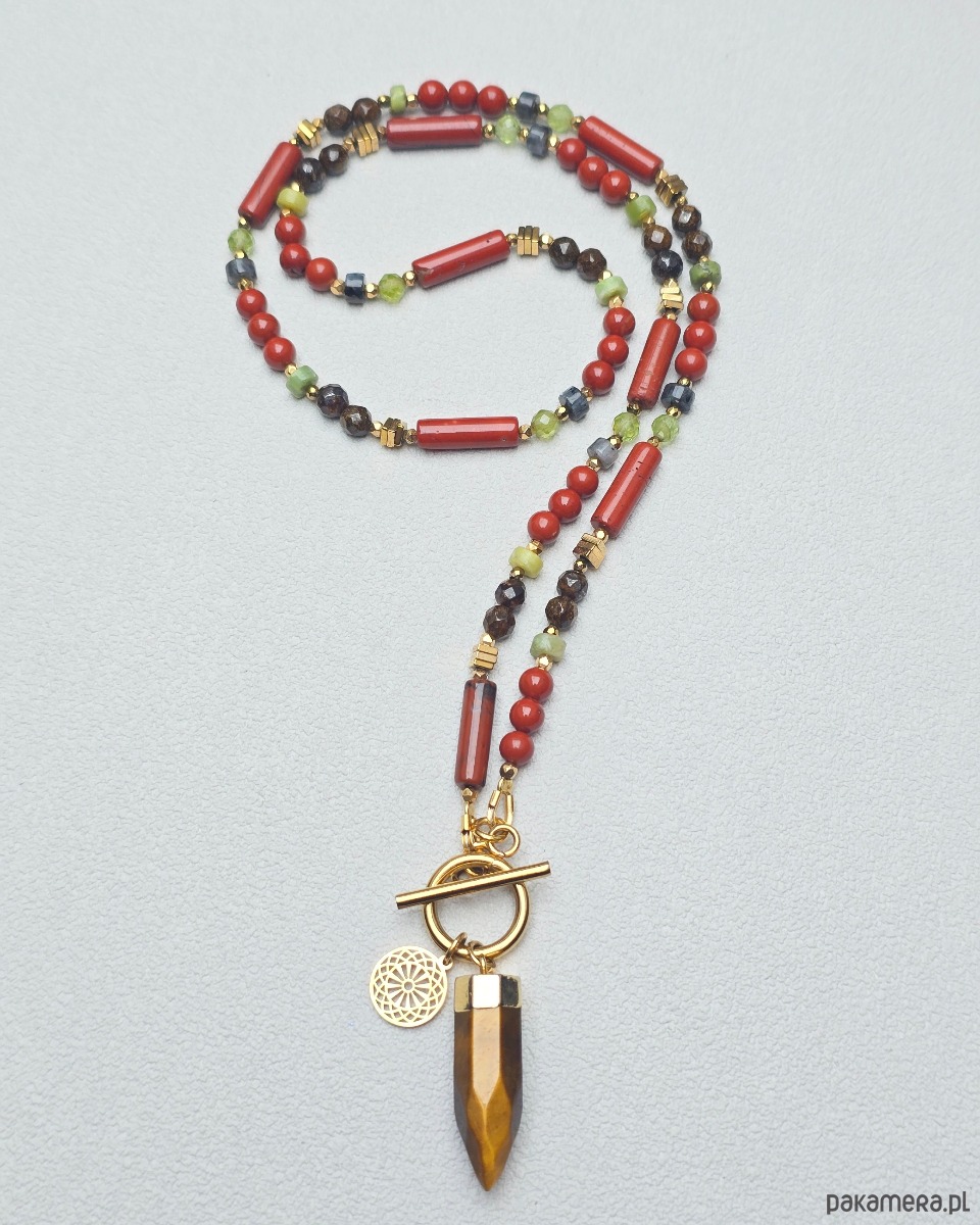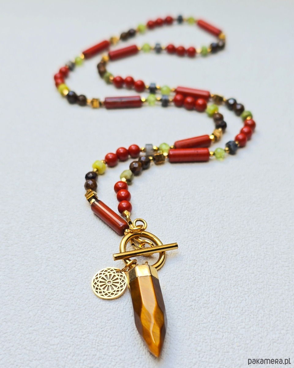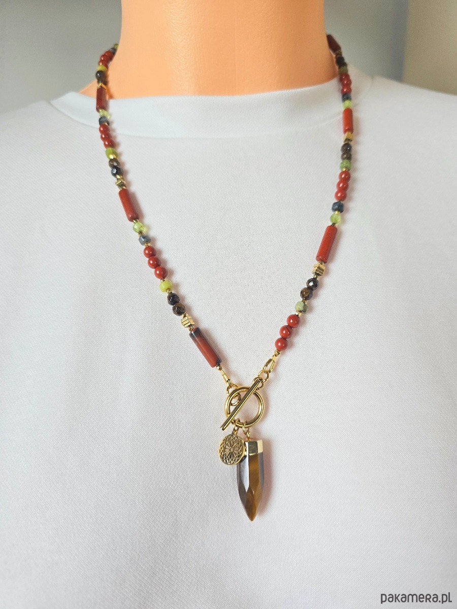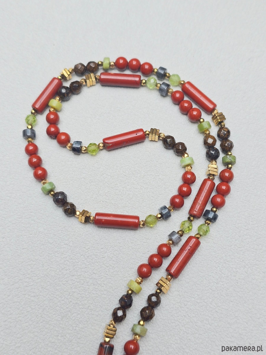 Wykorzystane kamienie: bronzyt, jaspis ceglasty, larkvit, peridot, tygrysie oko, złocony hematyt.