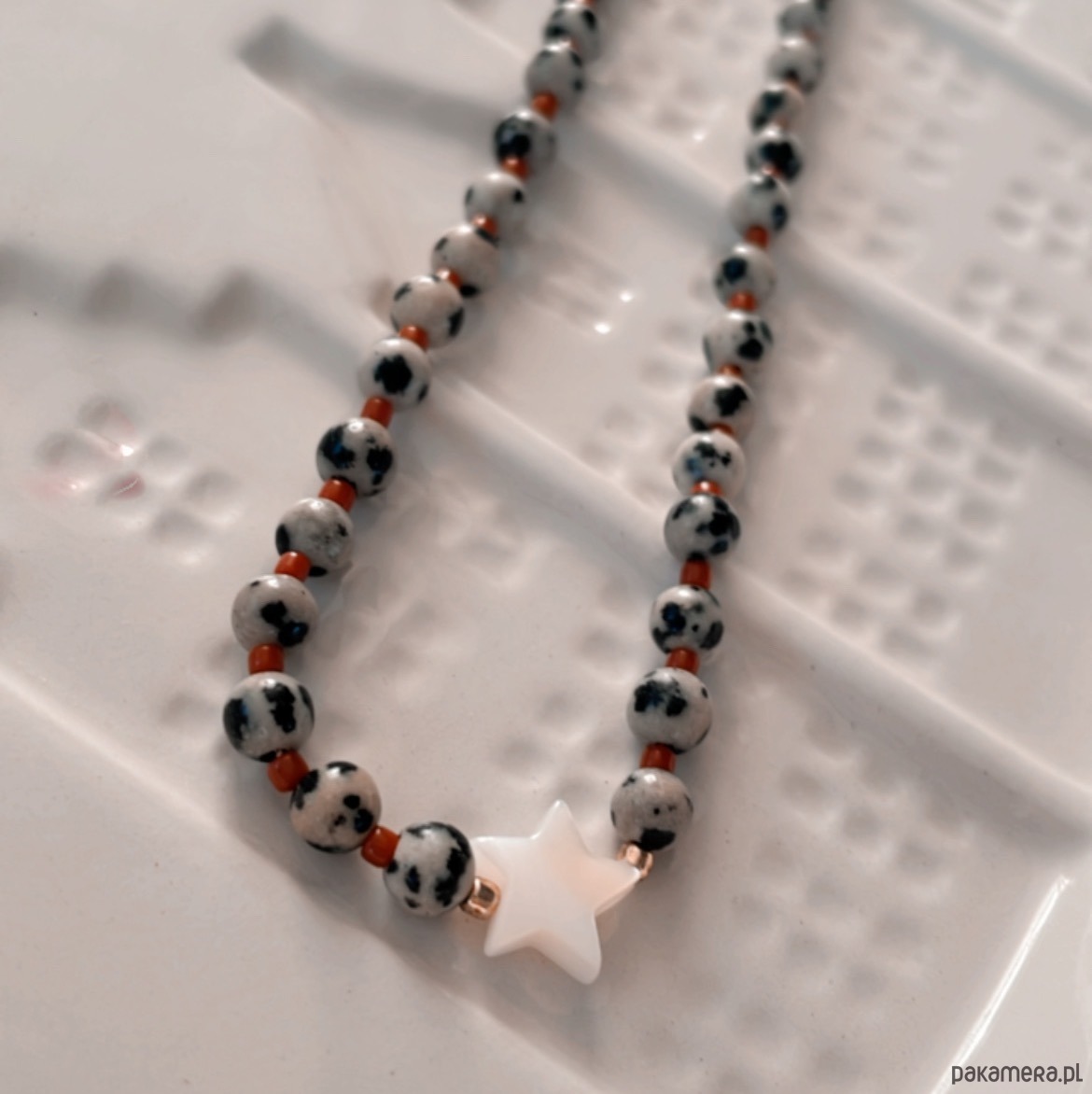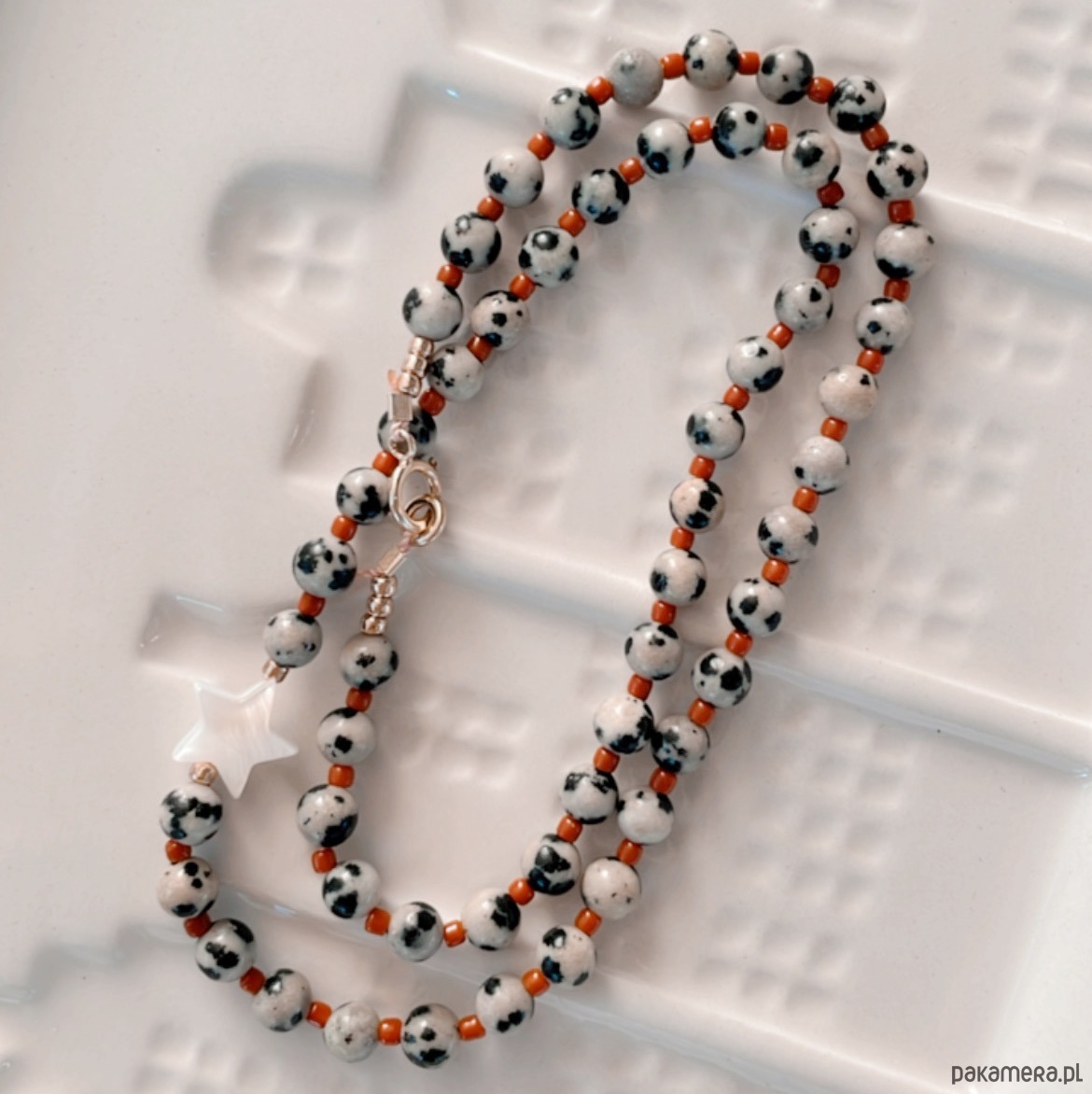 Naszyjnik wykonany własnoręcznie z jaspisu dalmatyńskiego, szklanych koralików, masy perłowej i nylonowej nici jubilerskiej. Zapięcie srebrne AG925 złocone.