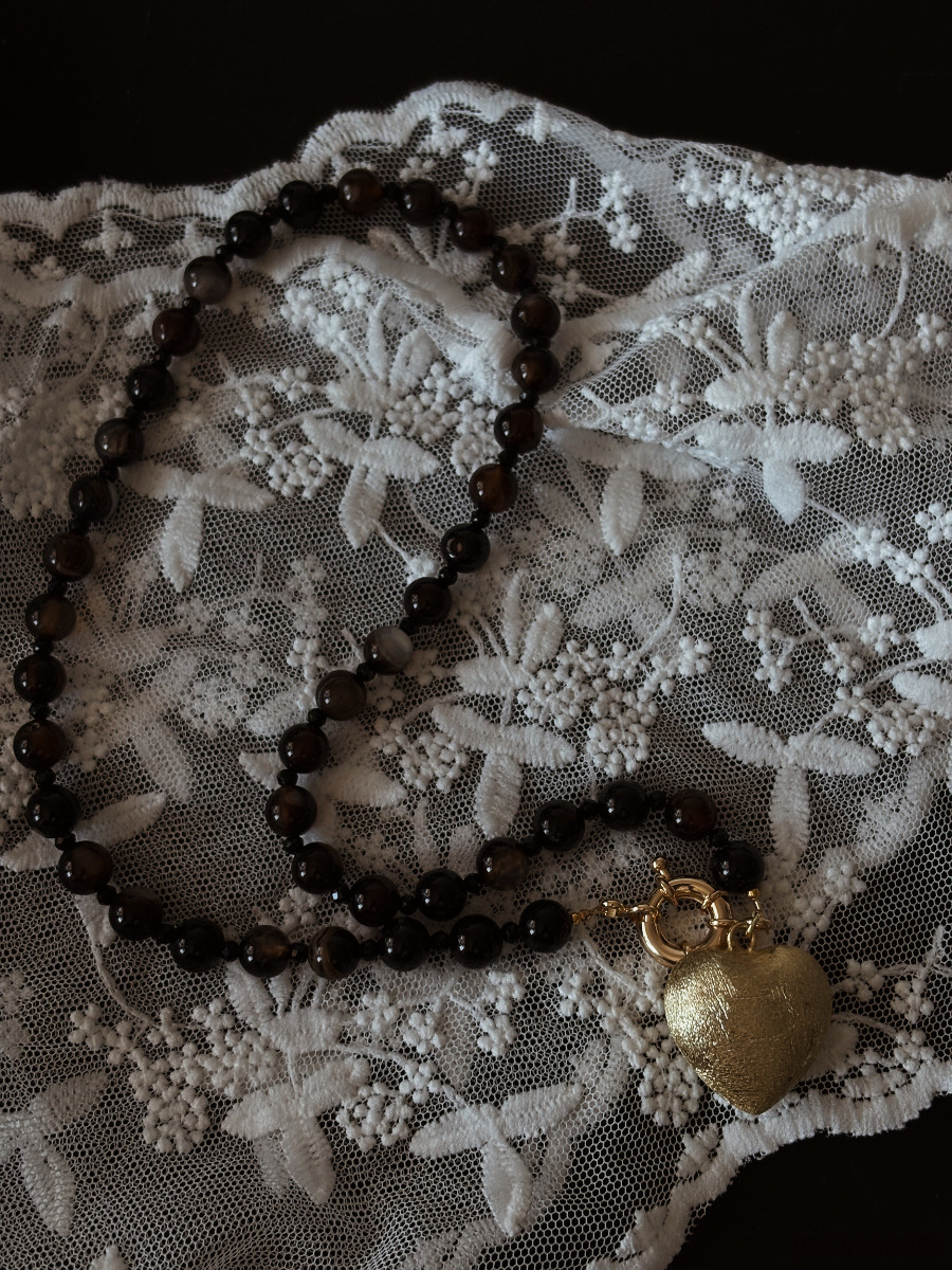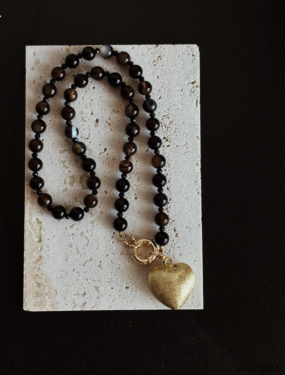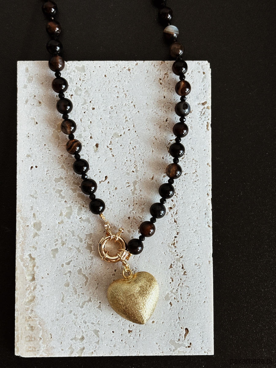 Naszyjnik wykonany jest agatu coffe z delikatnym cieniowaniem, przeplatamy onyksem fasetowanym i ozdobnym zapięciem. Wisienką na torcie jest duże serce- zawieszka z delikatną strukturą porysowania ( jest lekkie).