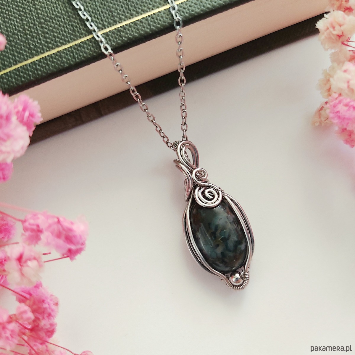 Naszyjnik z agatem mszystym wykonany ze stali chirurgicznej metodą wire wrapping to biżuteria, która zachwyca naturalnym pięknem i subtelnym urokiem. Ten wyjątkowy naszyjnik to połączenie magii natury i precyzyjnej pracy rękodzielniczej. Każdy egzemplarz został stworzony z dbałością o detale, dzięki czemu jest niepowtarzalny i pełen indywidualnego charakteru. Agat mszysty, o delikatnych, zielonych inkluzjach przypominających leśny mech, symbolizuje harmonię, wzrost i połączenie z naturą. Jego unikalna struktura sprawia, że każdy kamień wygląda inaczej, co czyni każdy naszyjnik prawdziwym dziełem sztuki.