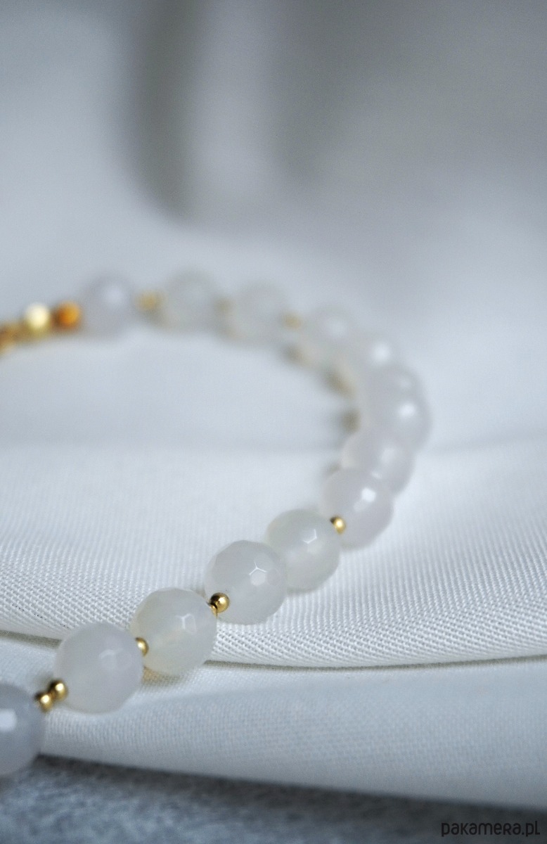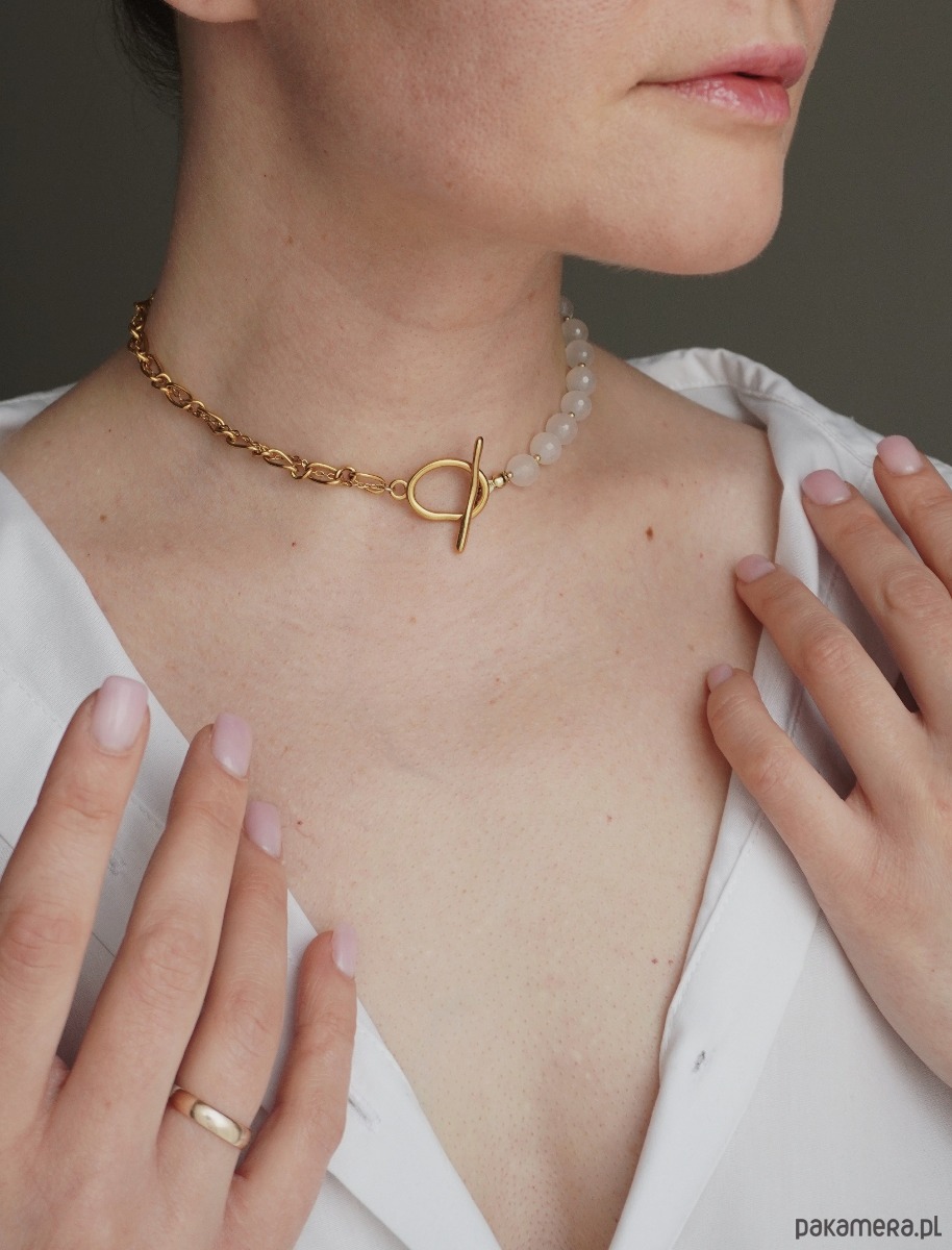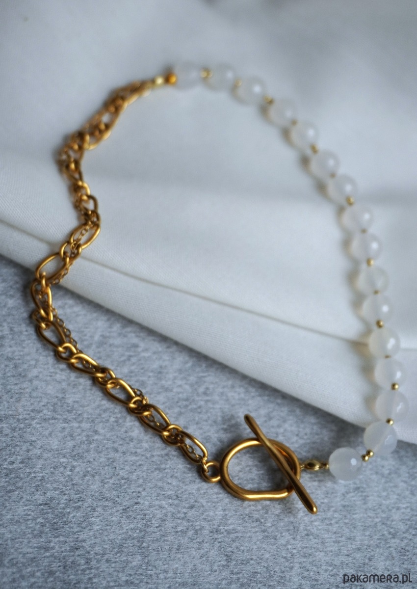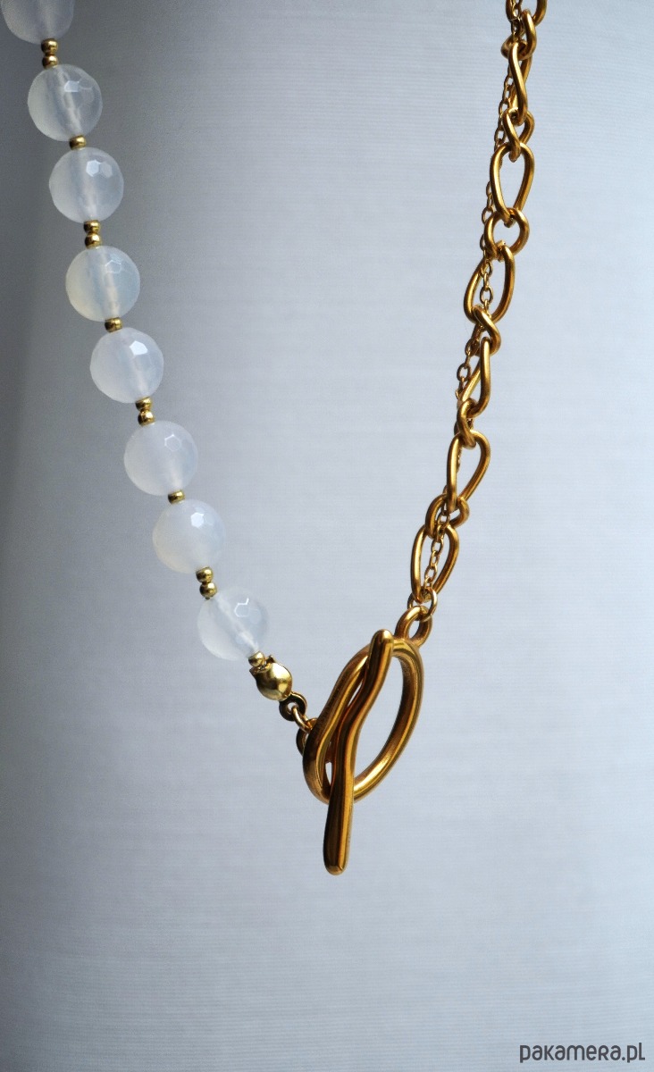 Elegancki naszyjnik z białym agatem i złotymi łańcuszkami ze stali szlachetnej oraz stylowym zapięciem typu toggle. Mlecznobiałe kamienie o delikatnym połysku symbolizują czystość i spokój, a złote akcenty nadają biżuterii wyrafinowanego i nowoczesnego wyglądu. Idealny dodatek dla osób ceniących minimalizm i odrobinę glamour. To idealna propozycja dla osób ceniących minimalizm i naturalne piękno kamieni naturalnych.