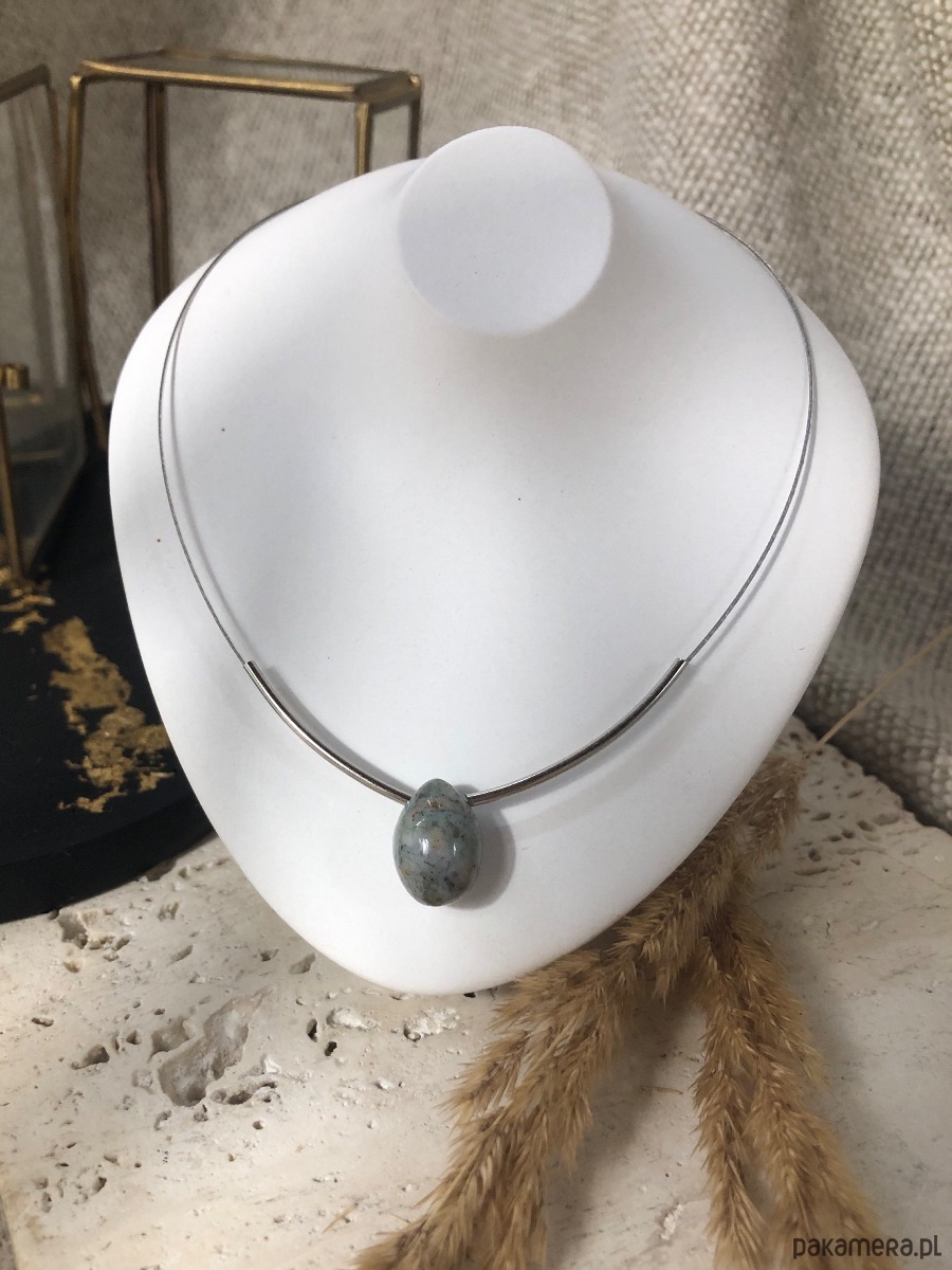 Subtelny naszyjnik wykonany z kamienia agatu na lince jubilerskiej. Linka ma długość około 50 cm. Kamień w kształcie kropelki o długości 1,5 cm. Naszyjnik posiada zapięcie typu toggle.