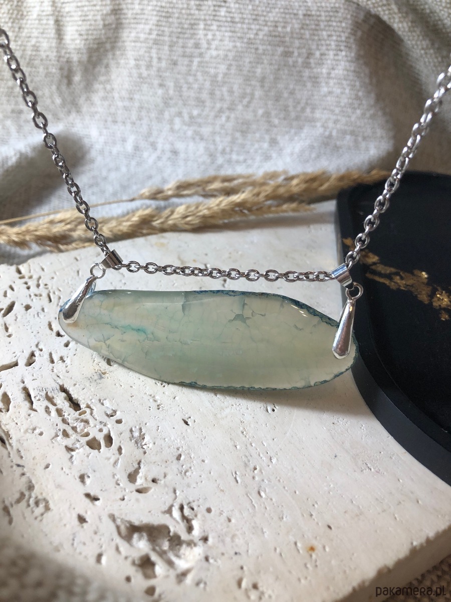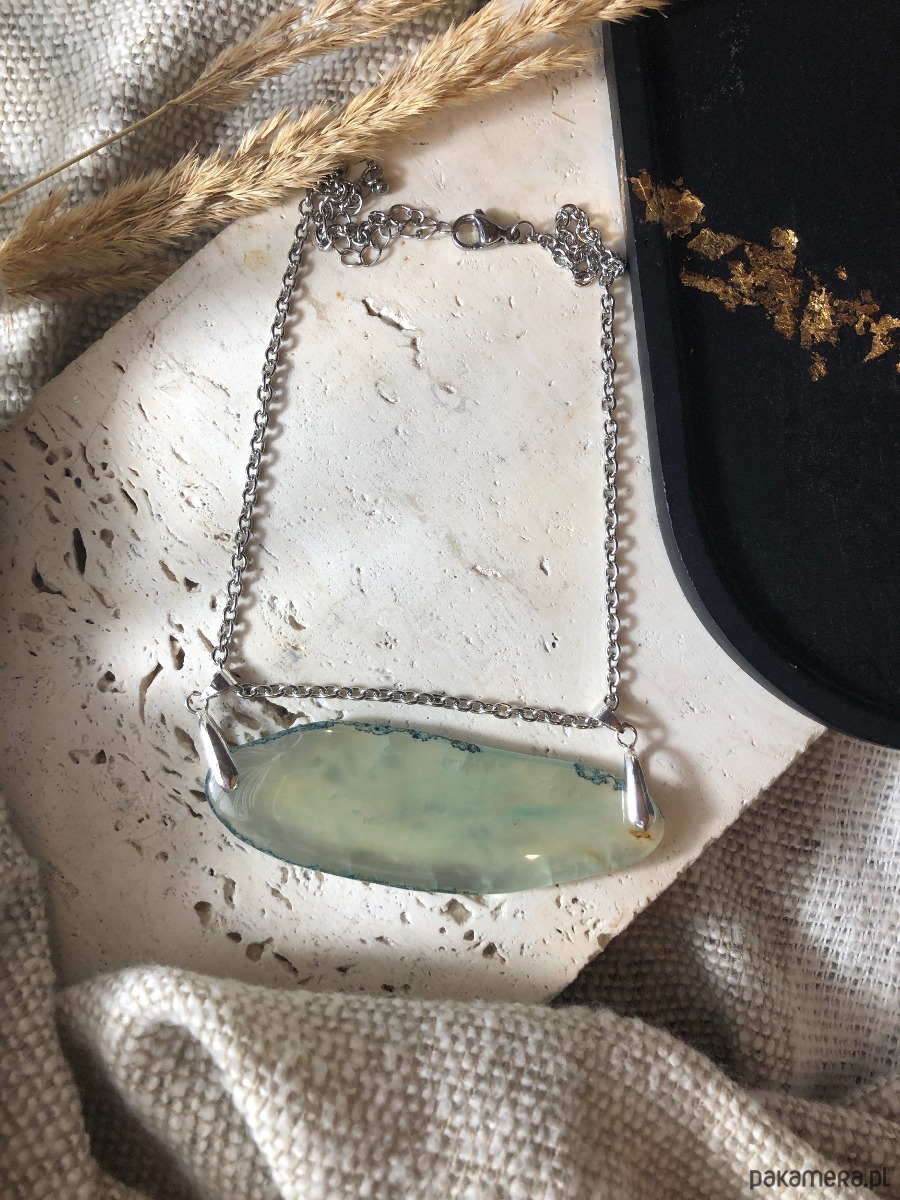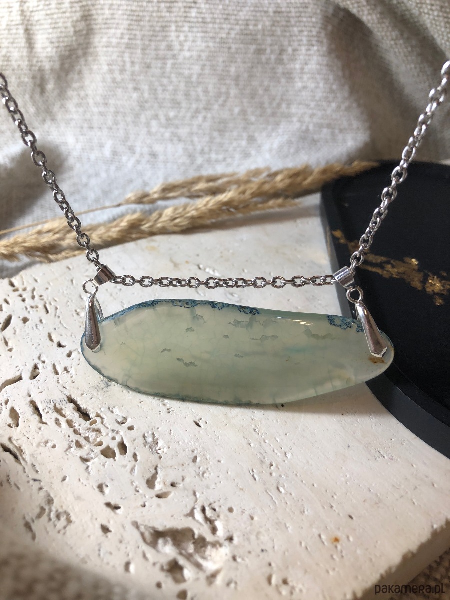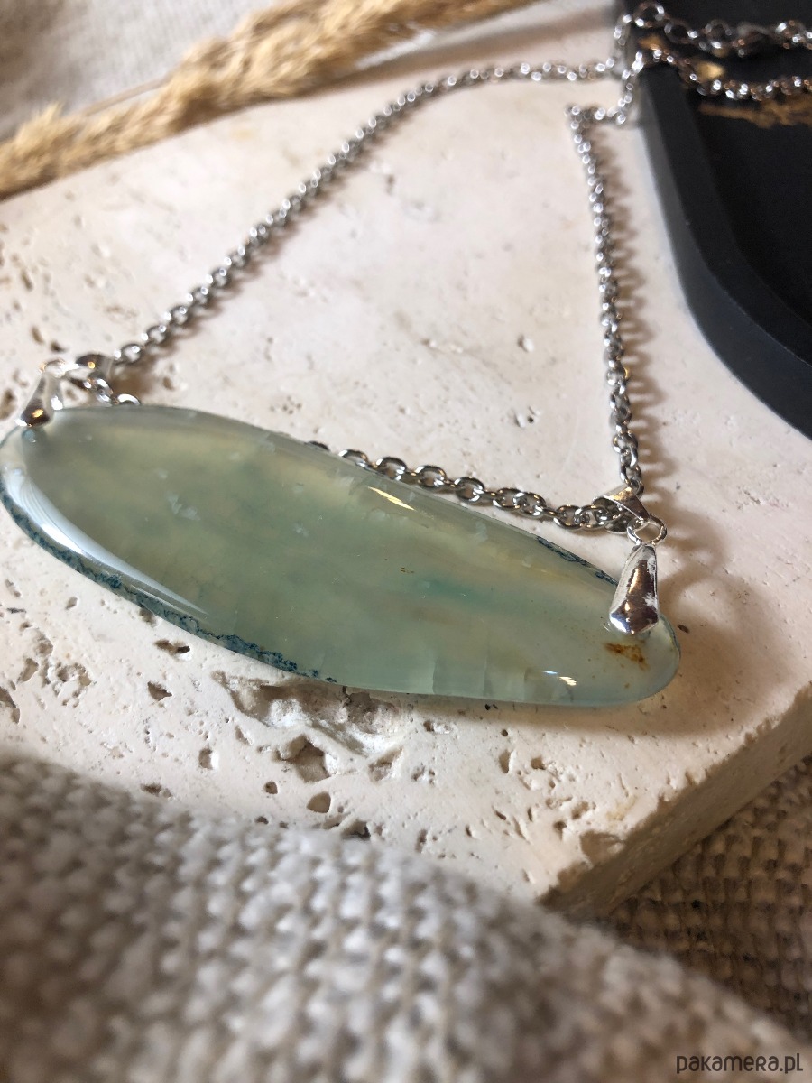 Naszyjnik wykonany z agatu i stali chirurgicznej. Kamień w odcieniu turkusu miejscami przepuszcza światło. Agat ma 8 cm długości. Naszyjnik ma 40 cm i posiada zapięcie typu karabińczyk z przedłużką 5 cm.