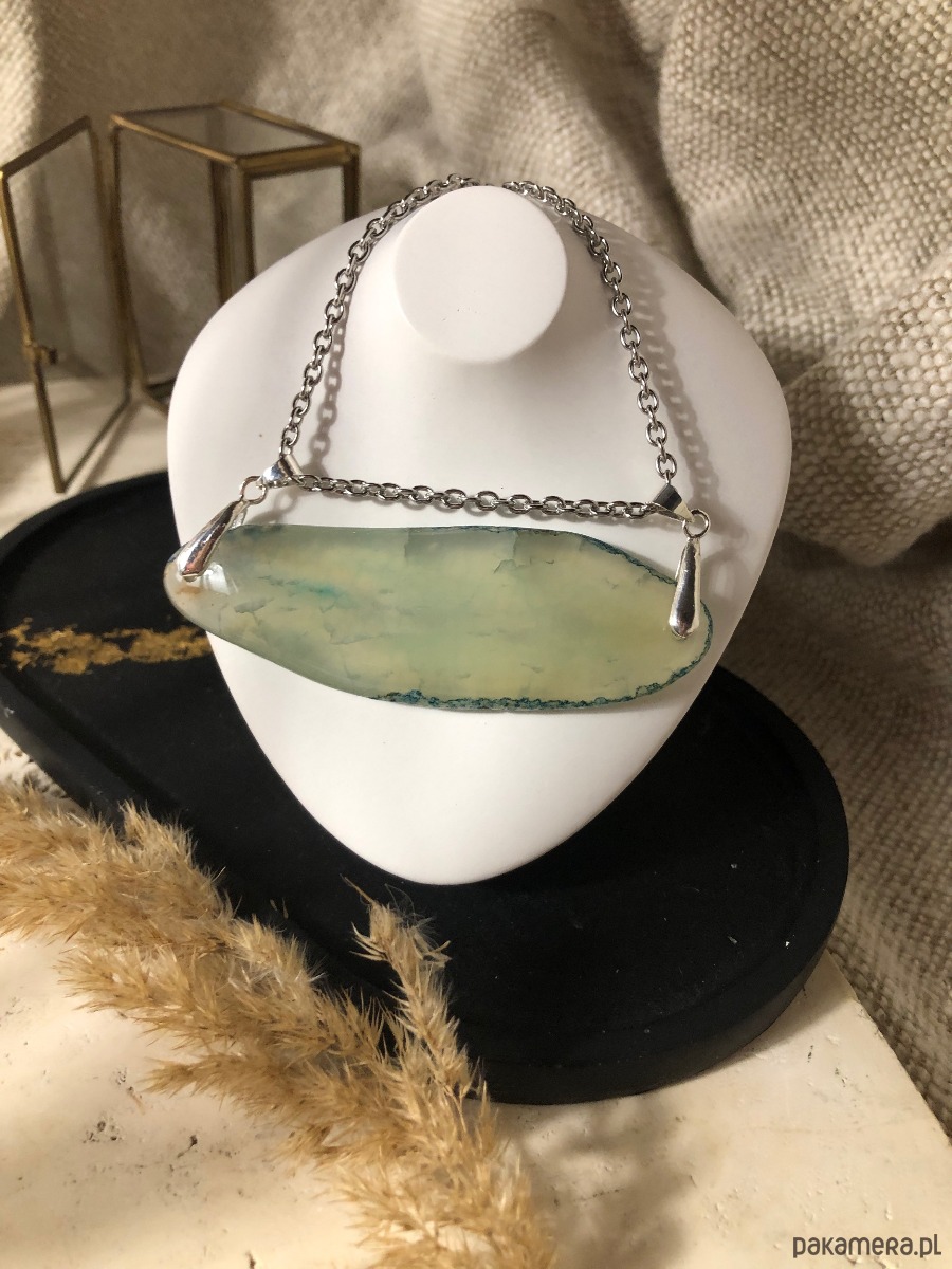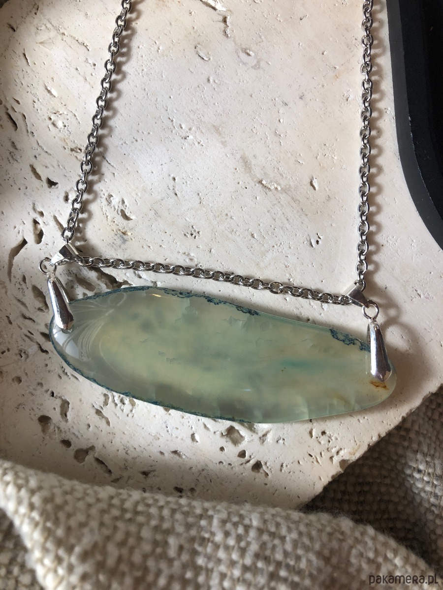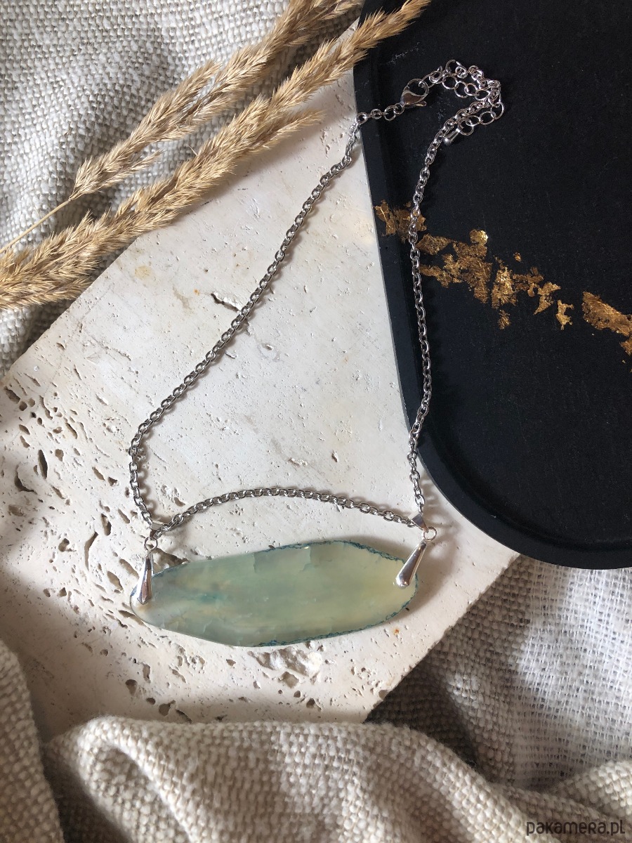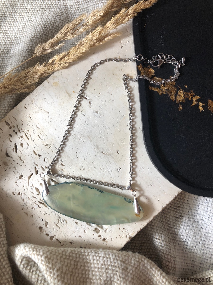 Naszyjnik wykonany z agatu i stali chirurgicznej. Kamień w odcieniu turkusu miejscami przepuszcza światło. Agat ma 8 cm długości. Naszyjnik ma 40 cm i posiada zapięcie typu karabińczyk z przedłużką 5 cm.
