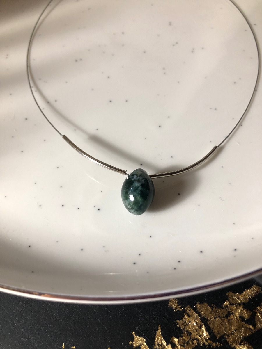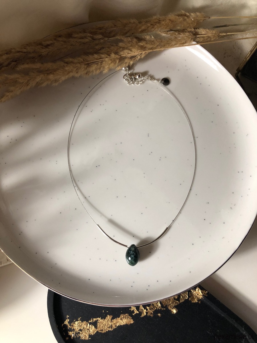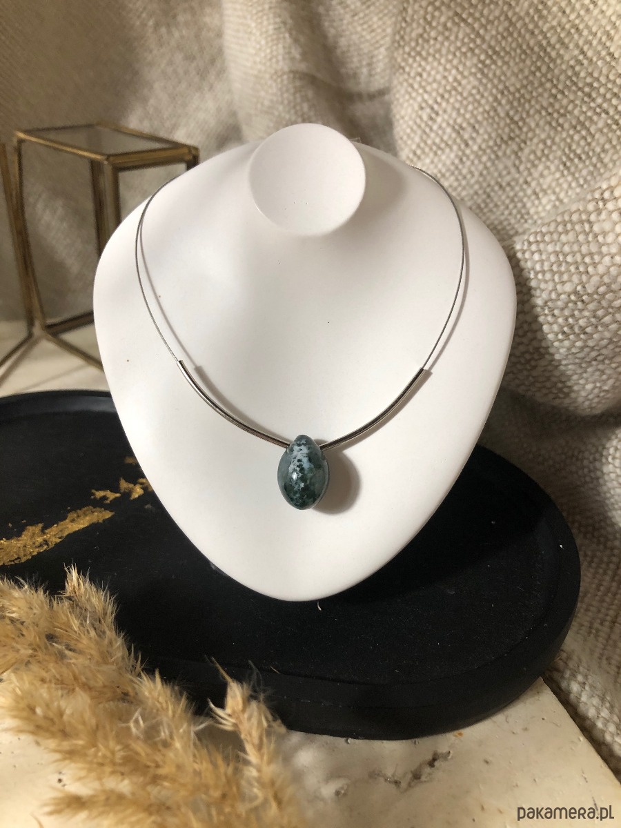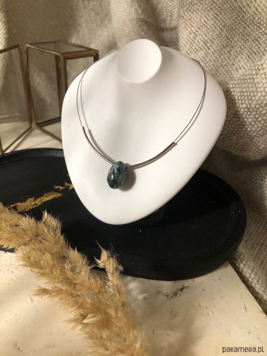 Subtelny naszyjnik wykonany z kamienia agatu na lince jubilerskiej. Linka ma długość 41 cm plus 4 cm regulacji. Kamień w kształcie kropelki o długości 1,5 cm. Naszyjnik posiada zapięcie typu karabińczyk.