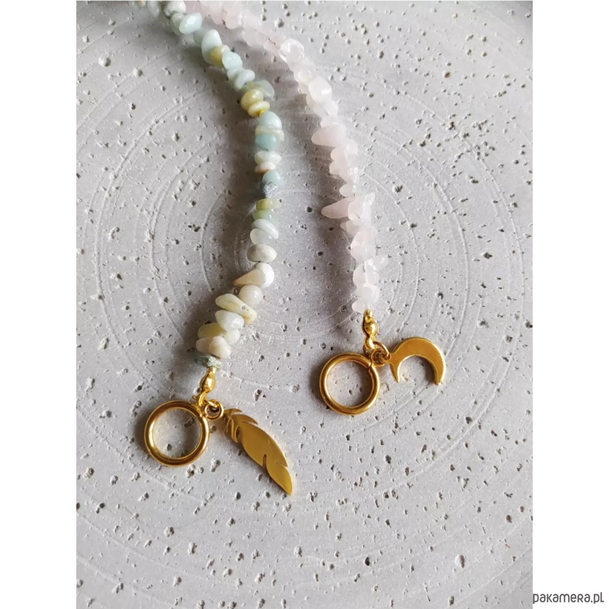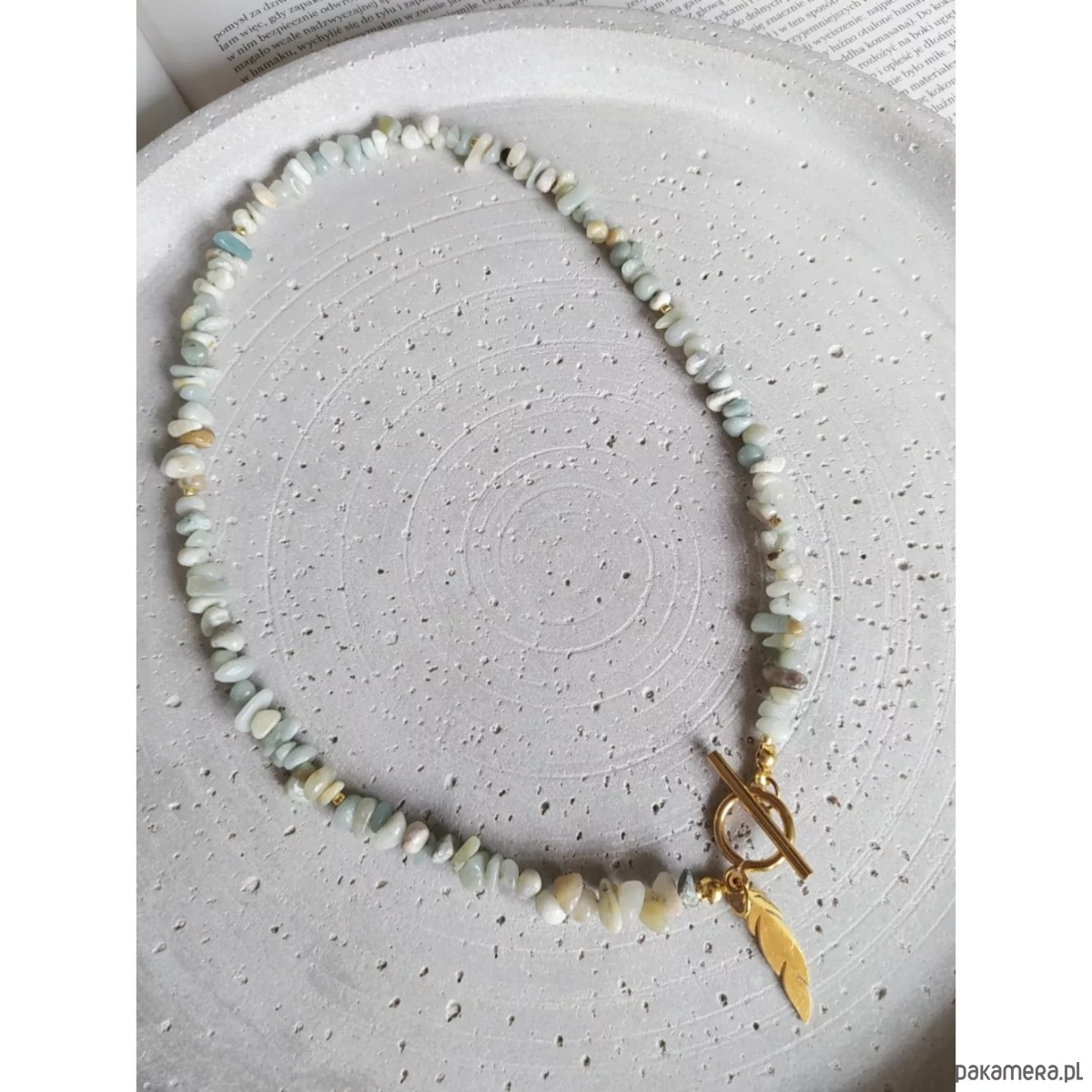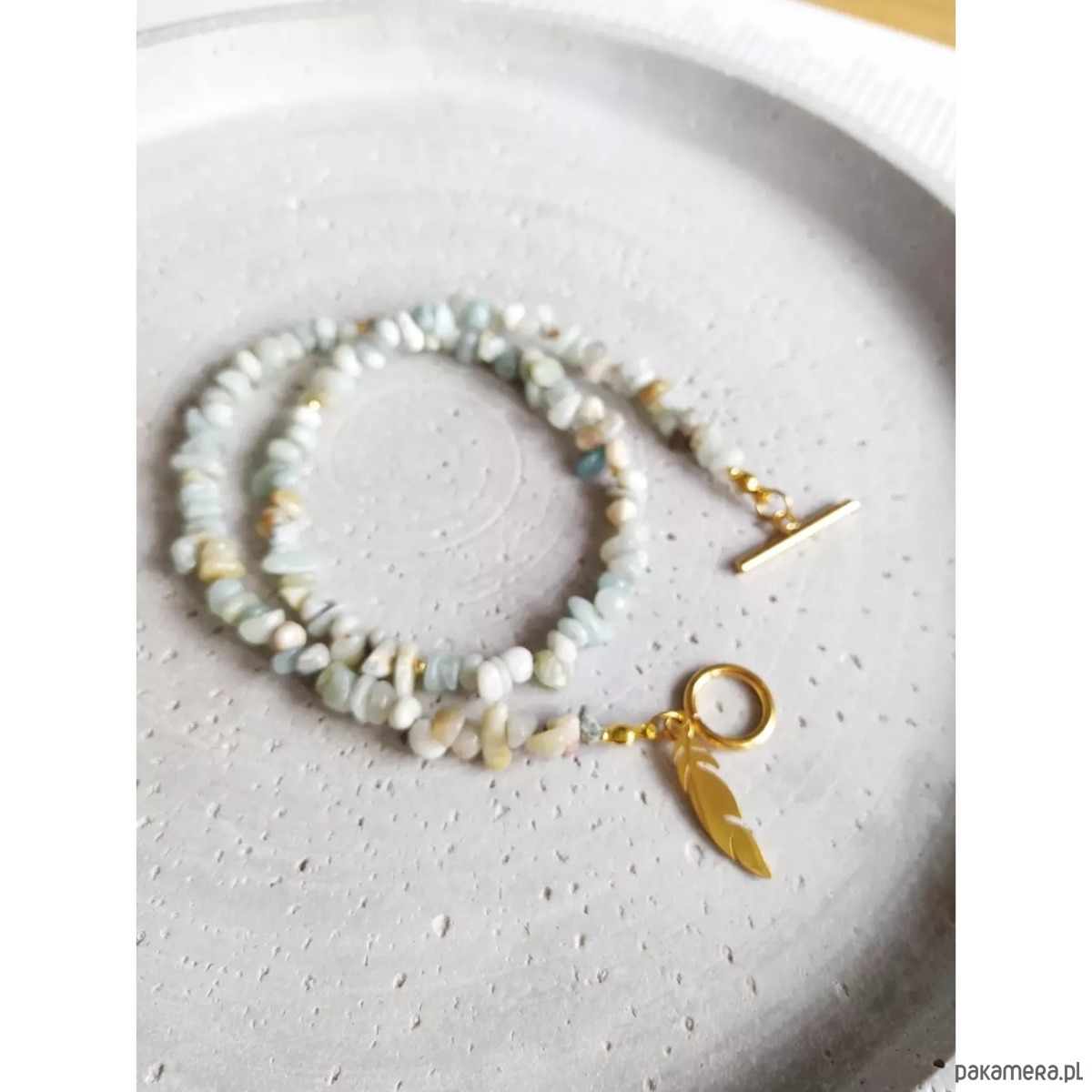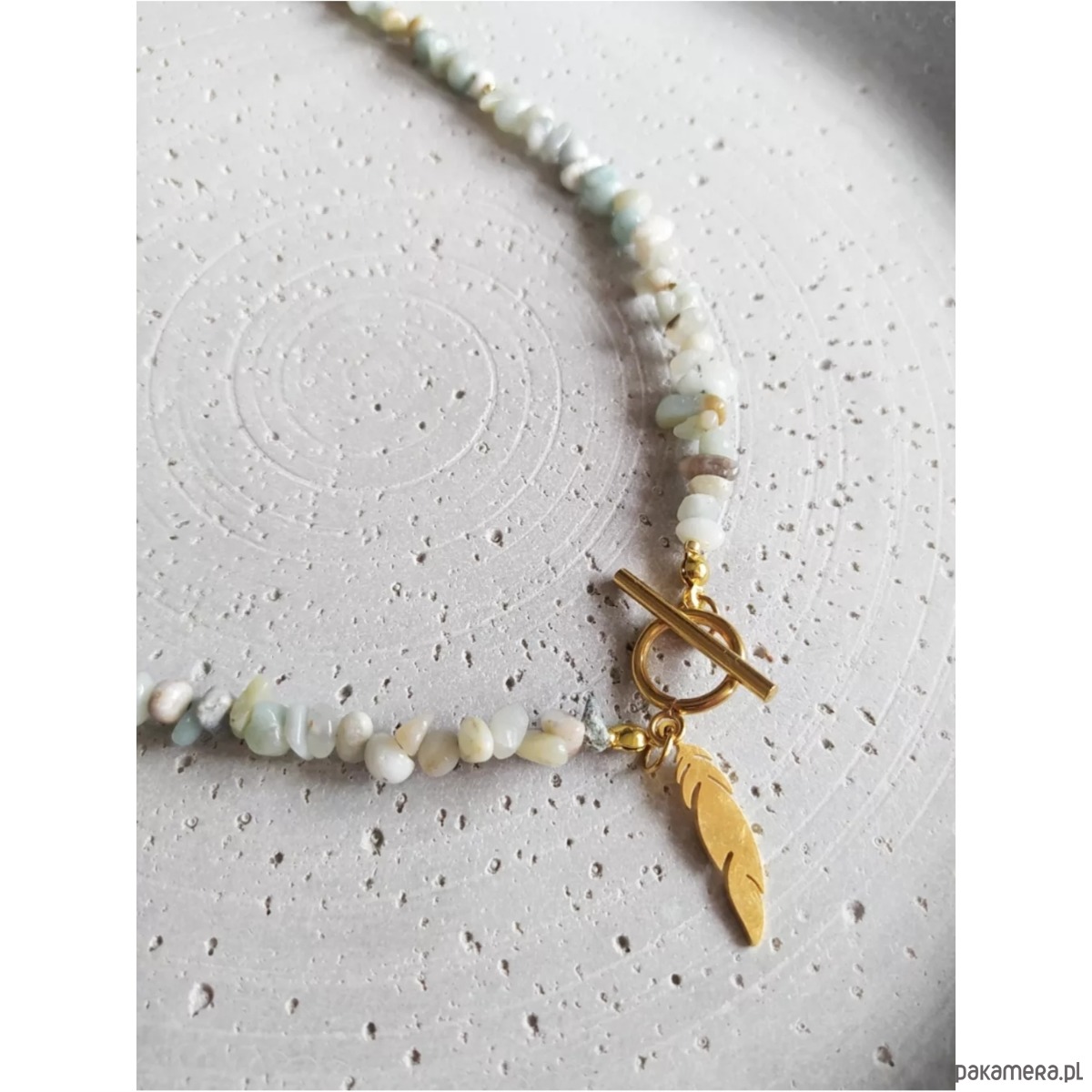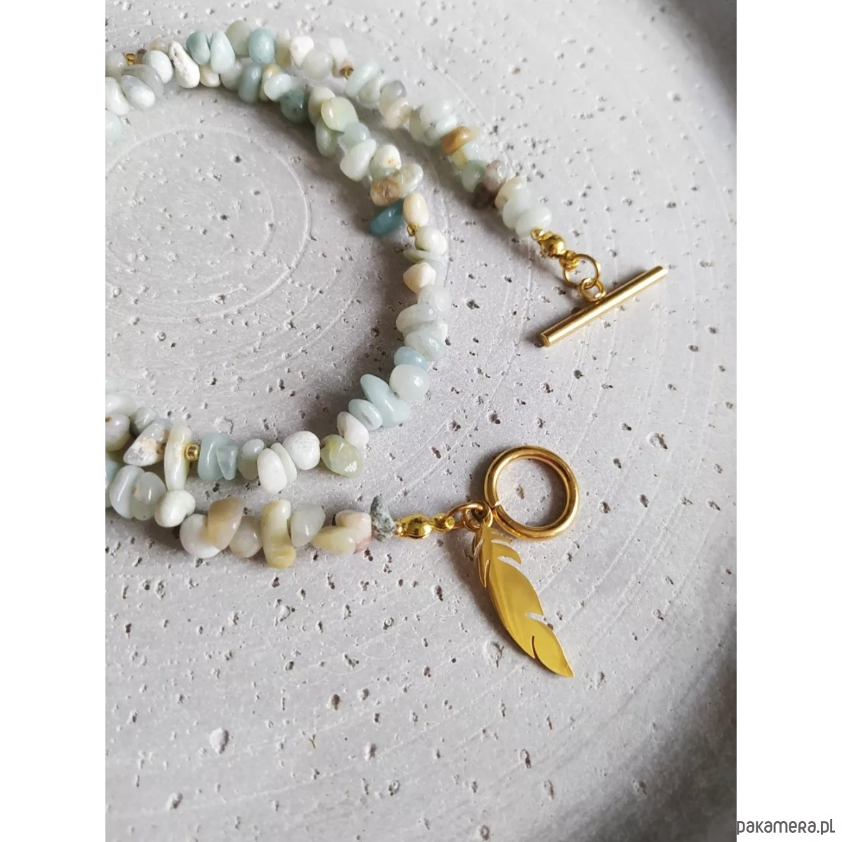 Naszyjnik/ choker, wykonany z kamieni Amazonit w pastelowym odcieniu mięty oraz beżu, o nieregularnych kształtach. Całość przepleciona koralikami ze szkła japońskiego, w kolorze złota. Zapinany na oryginalną przewlekaną klamrę. Całości uroku dodaje zawieszka w kształcie piórka. Złota klamra oraz złote piórko są ze stali nierdzewnej.