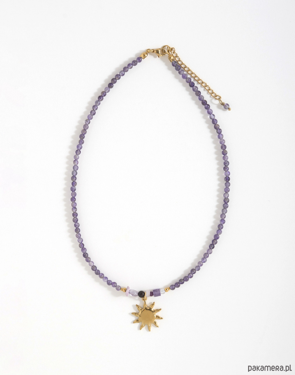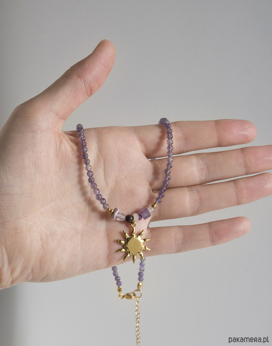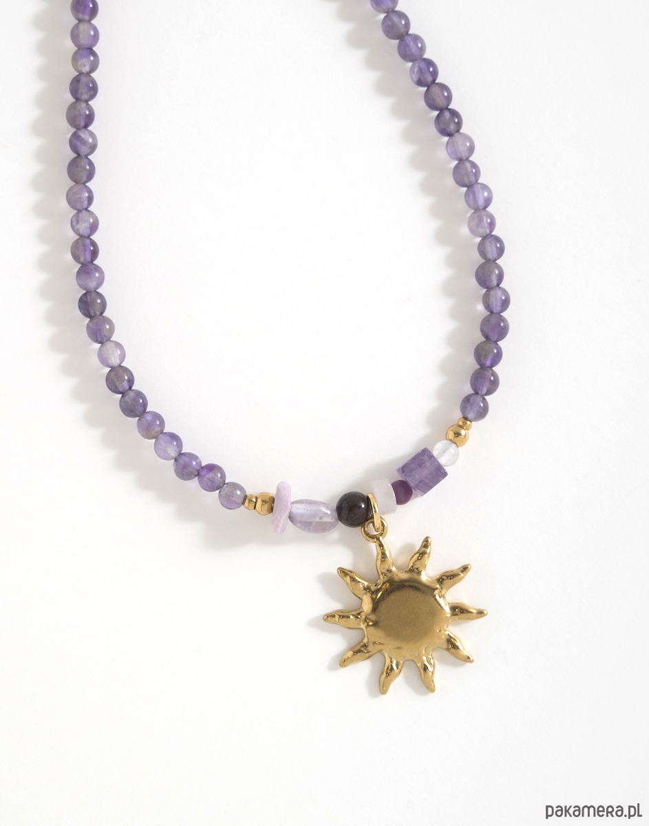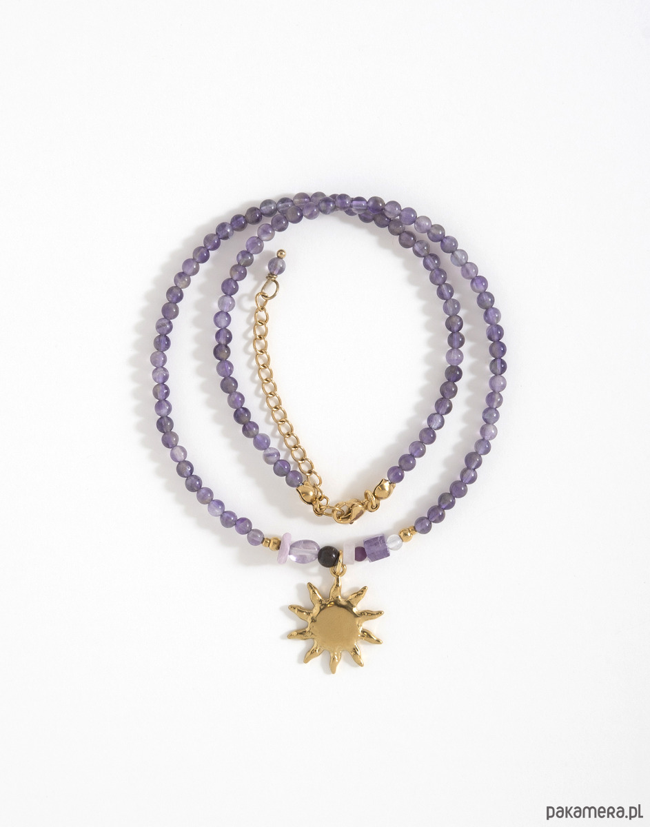 Naszyjnik wykonano ręcznie, z głównym kamieniem – ametystem. W centralnej części znajdują się kamienie o różnych wielkościach: agat, kryształ górski, granat, kwarc, ametyst oraz fosfosyderyt . Elementy zapięcia i zawieszka w kształcie słońca wykonano ze złotej stali chirurgicznej.